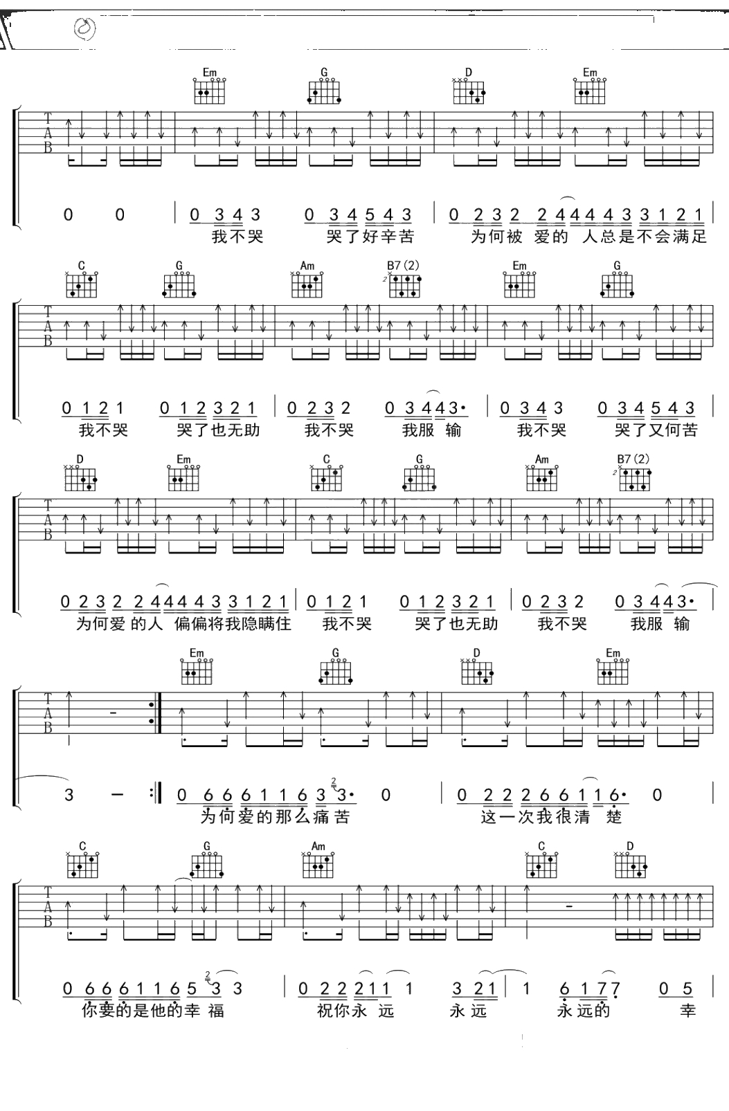 黄义达《我不哭》吉他谱 C调弹唱六线谱吉他谱