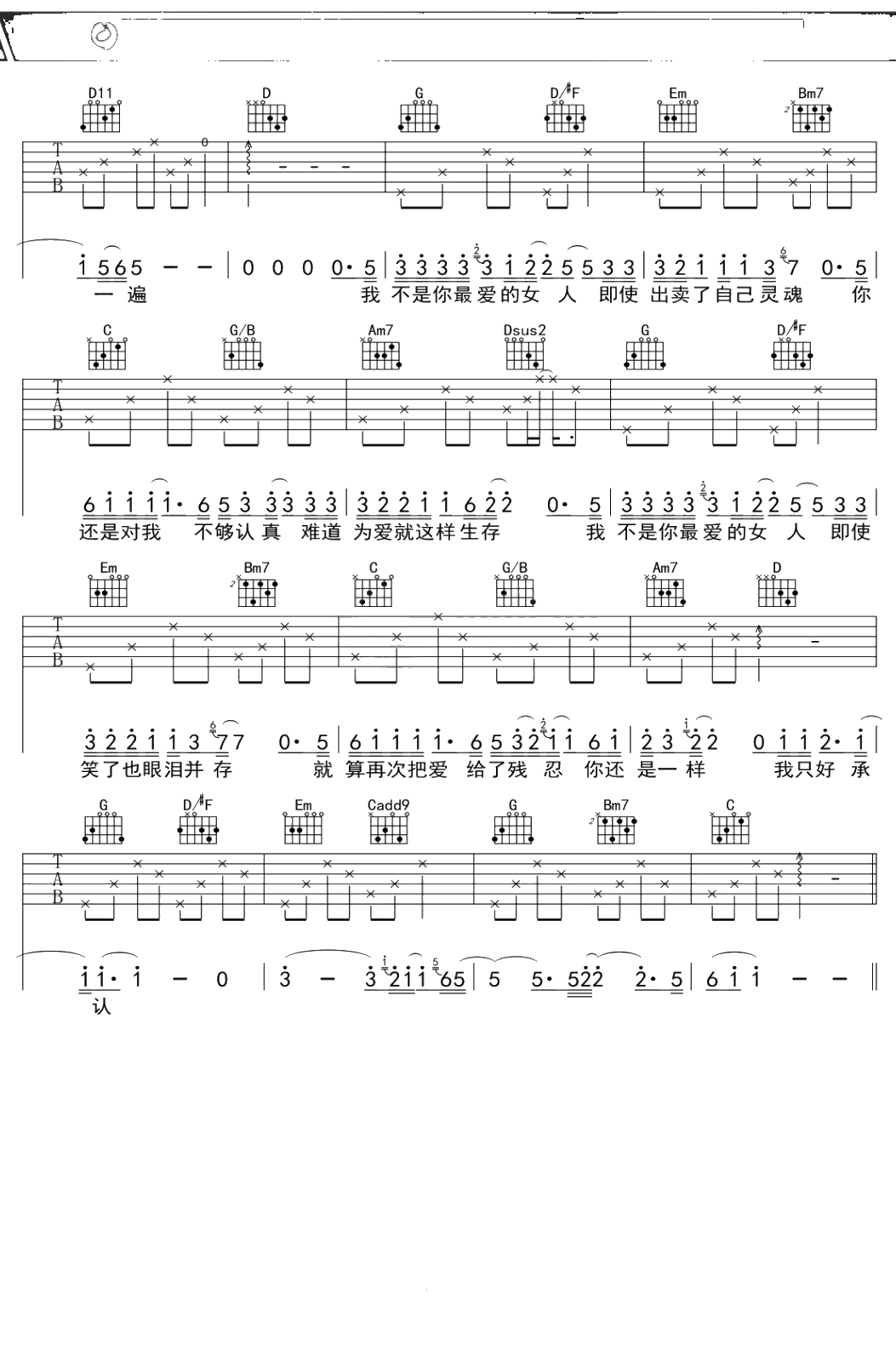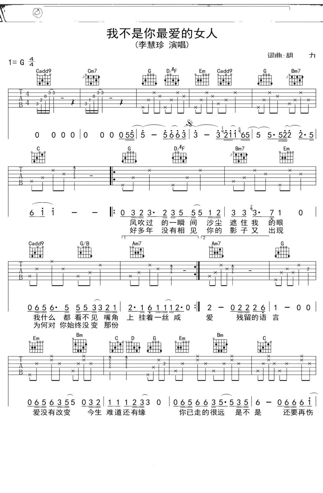 李慧珍《我是不是你最爱的女人》吉他谱 G调弹唱六线谱