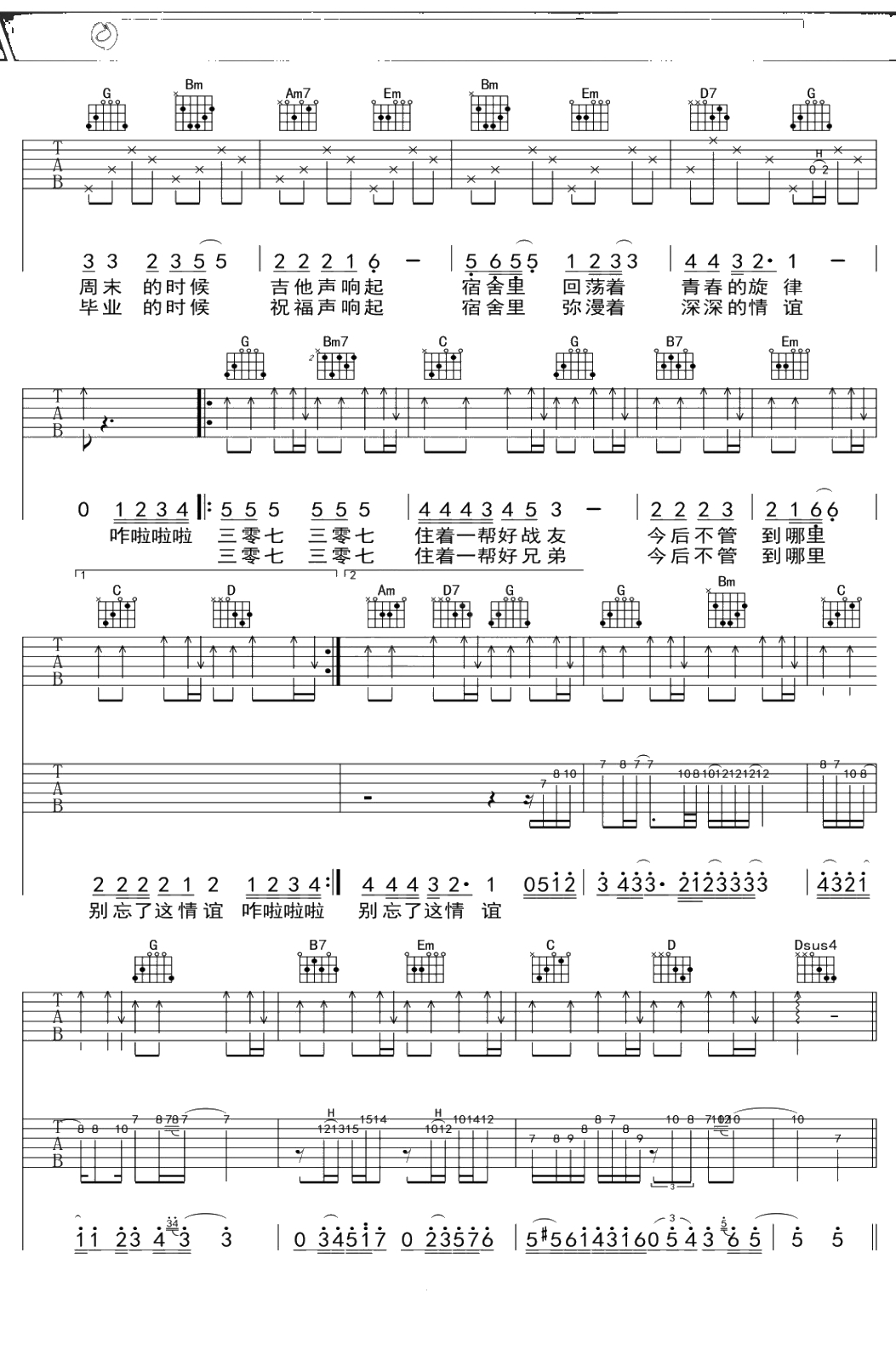 庞龙《我们的宿舍307》吉他谱 G调弹唱六线谱吉他谱
