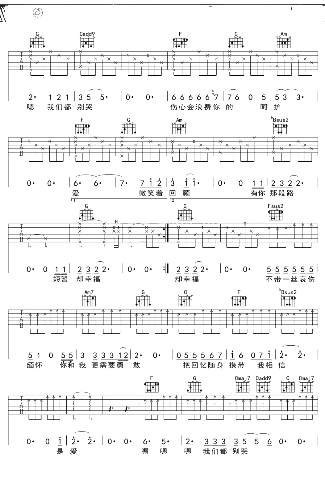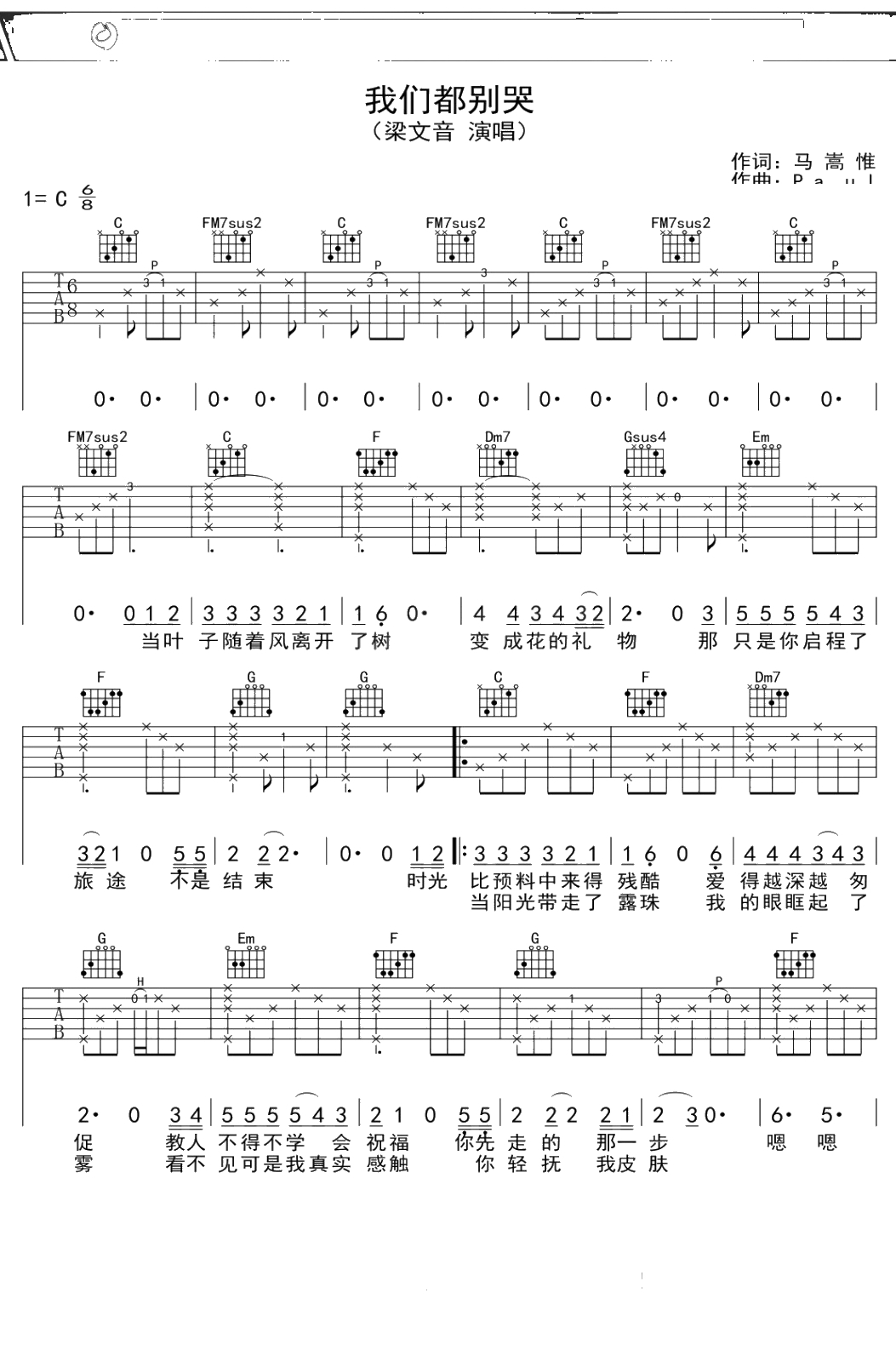 梁文音《我们都别哭》吉他谱 C调弹唱六线谱