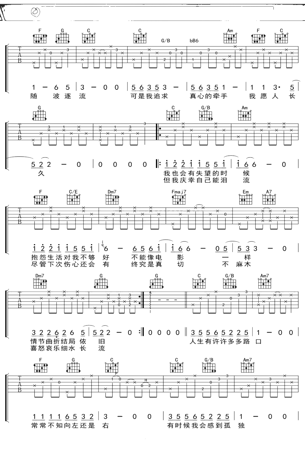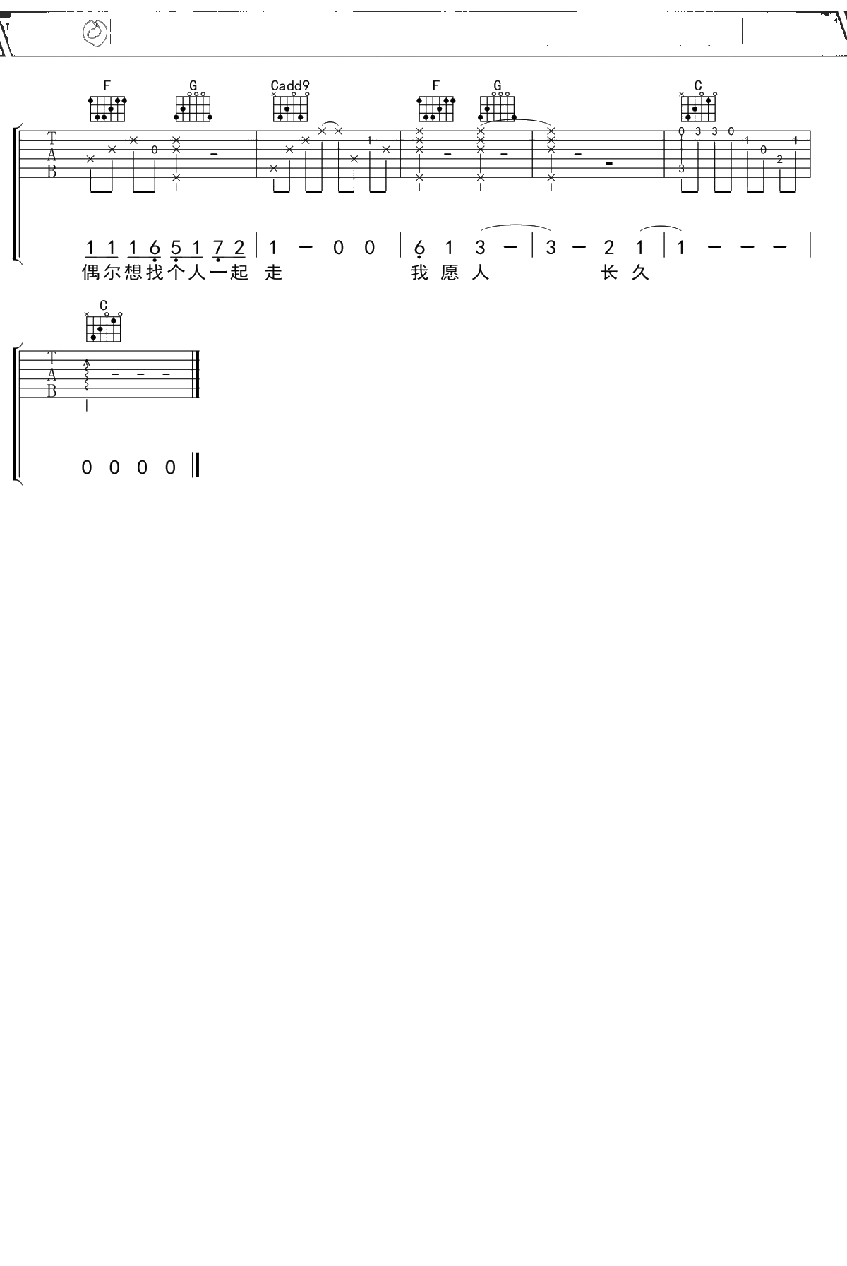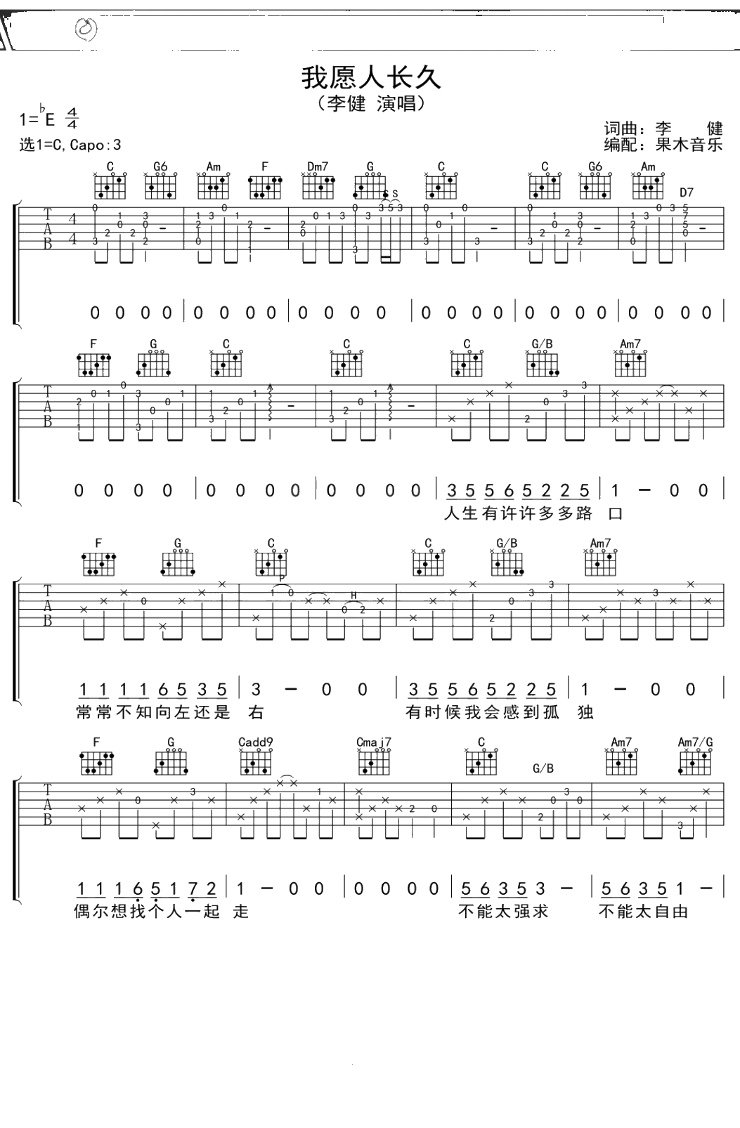 李健《我愿人长久》吉他谱 C调弹唱六线谱