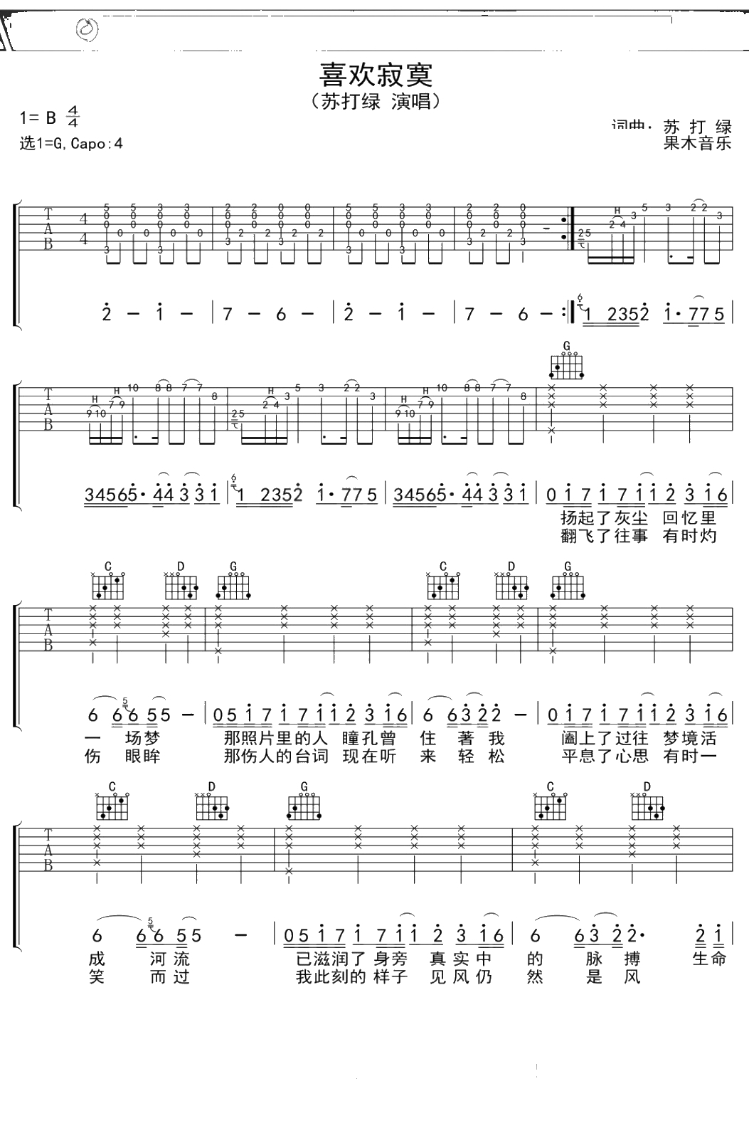 苏打绿《喜欢寂寞》吉他谱 G调弹唱六线谱