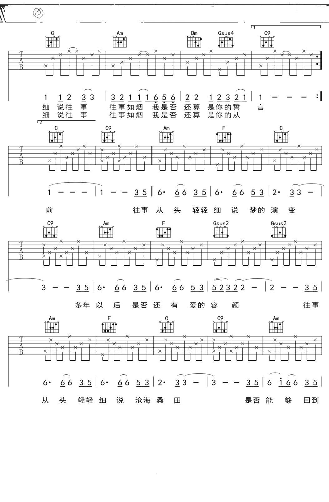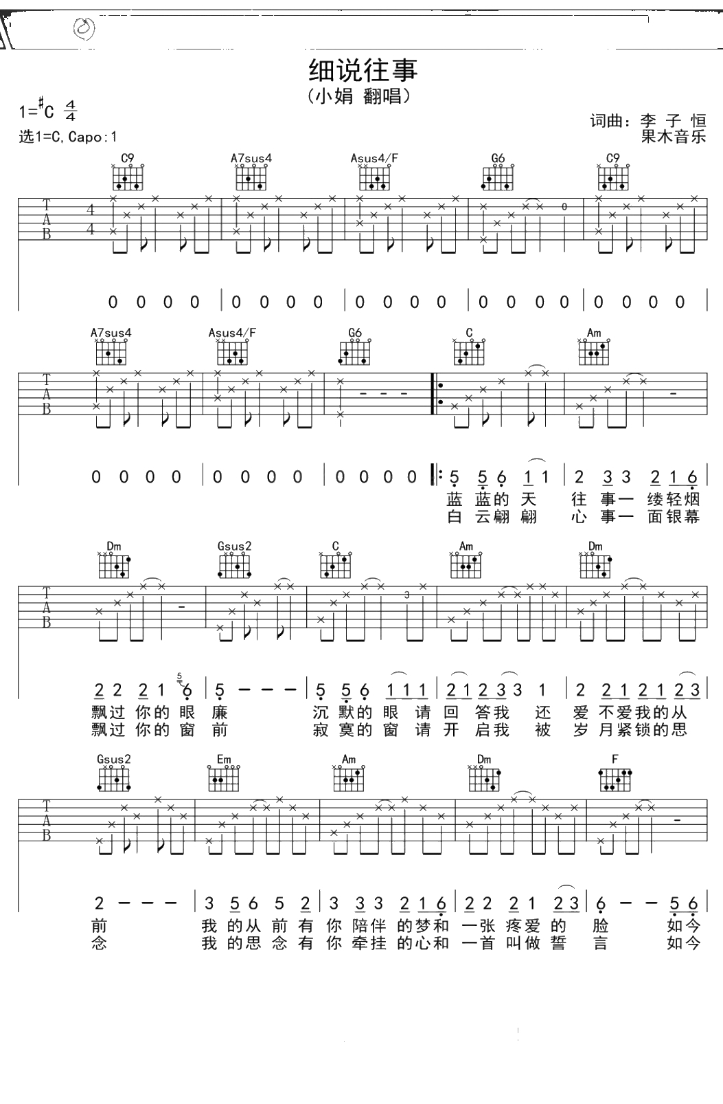 小娟《细说往事》吉他谱 C调弹唱六线谱吉他谱