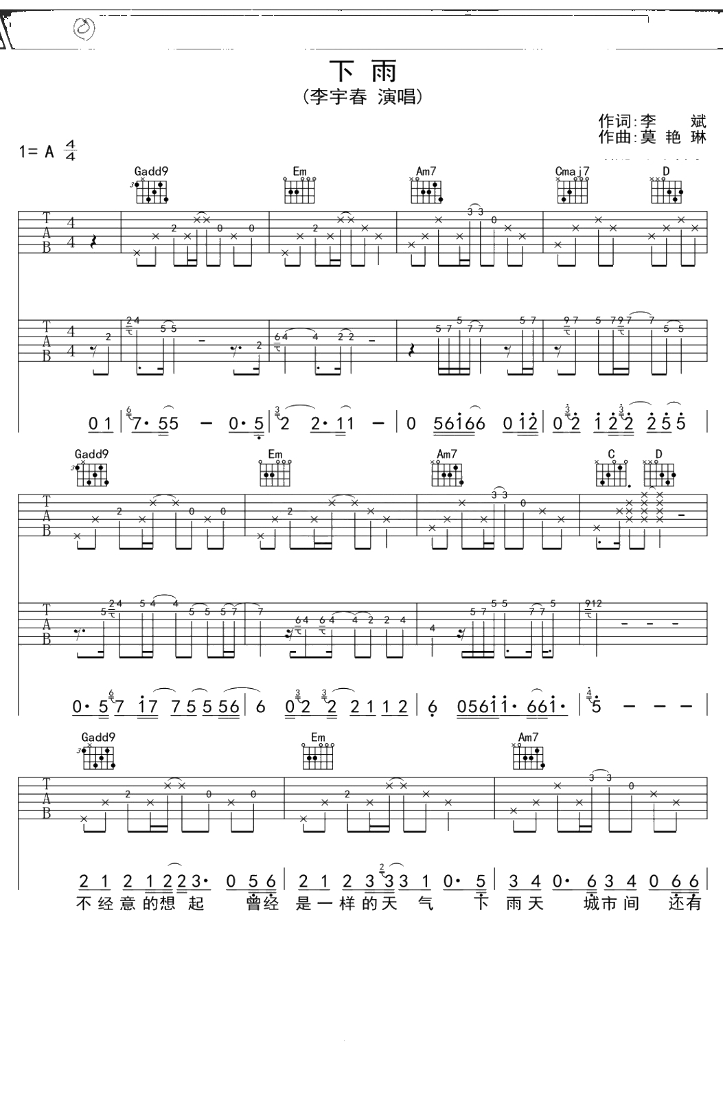 李宇春《下雨》吉他谱 A调弹唱六线谱吉他谱