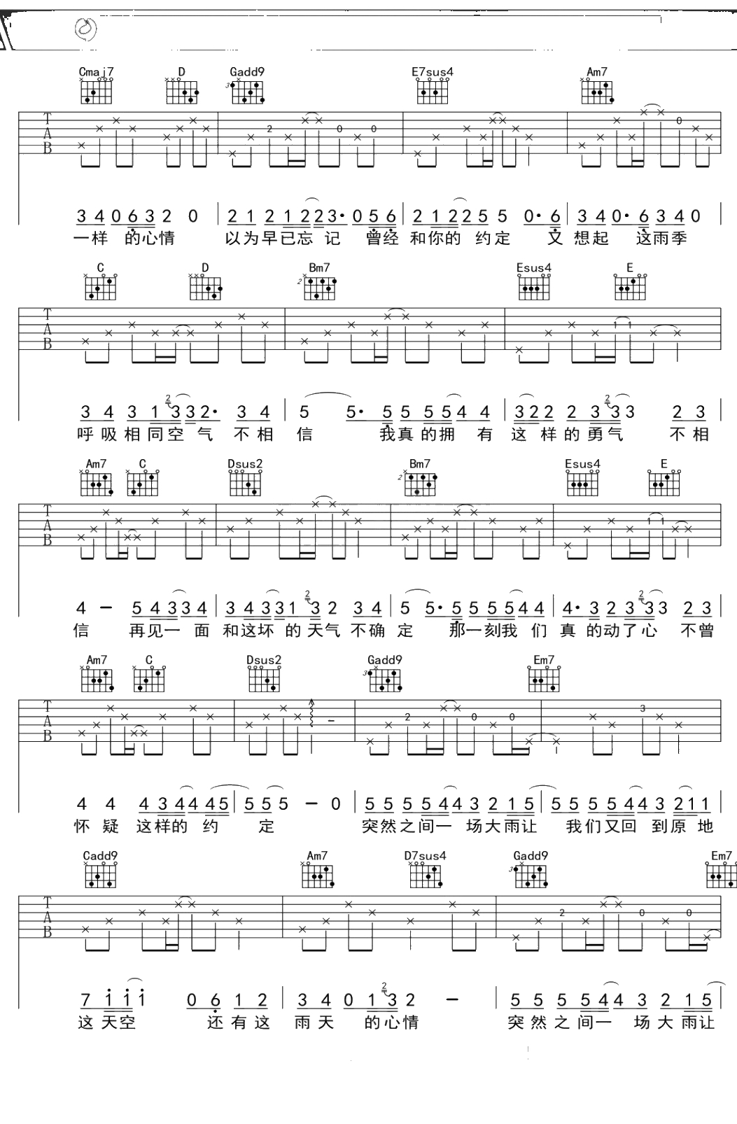 李宇春《下雨》吉他谱 A调弹唱六线谱