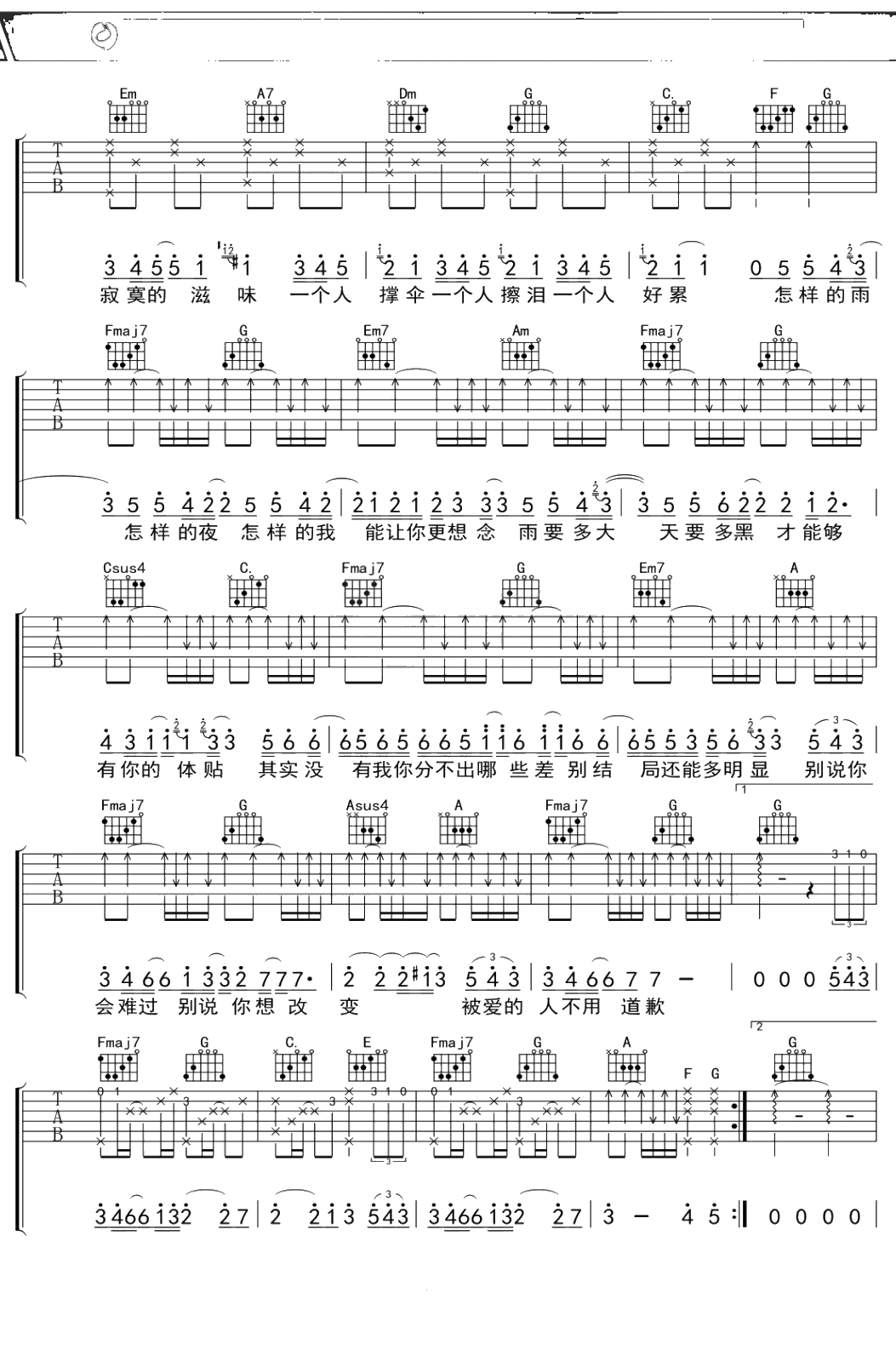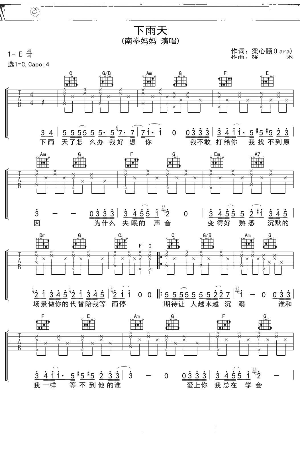 南拳妈妈《下雨天》吉他谱 C调弹唱六线谱
