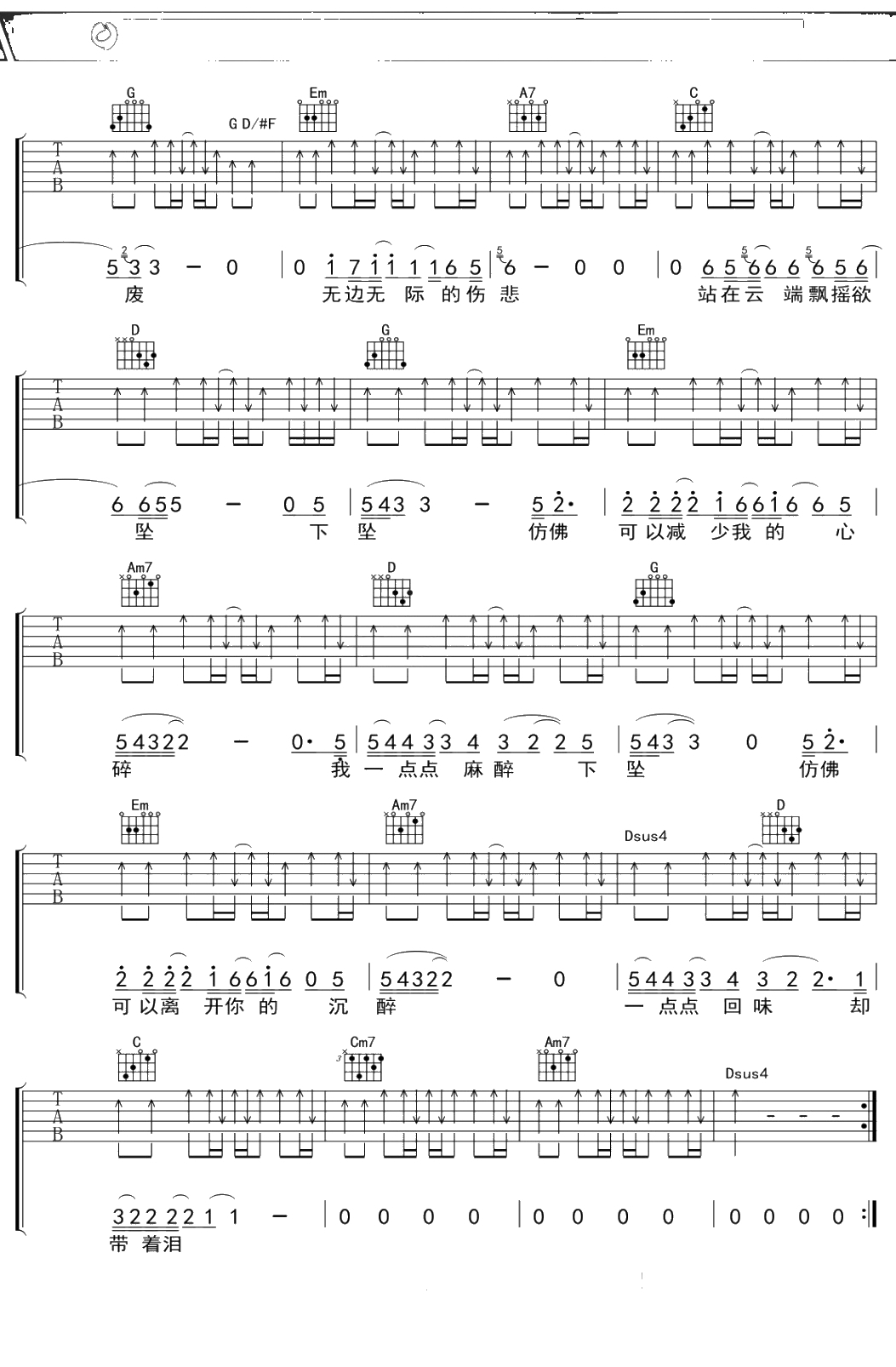 汪峰《下坠》吉他谱 G调弹唱六线谱吉他谱