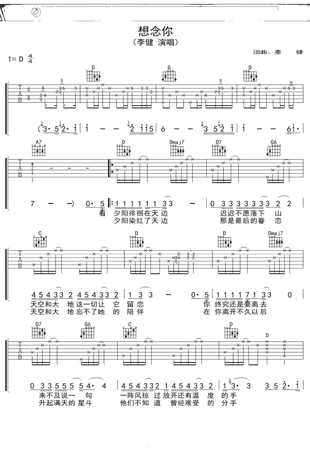 李健《想念你》吉他谱 D调弹唱六线谱
