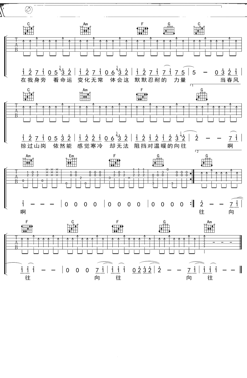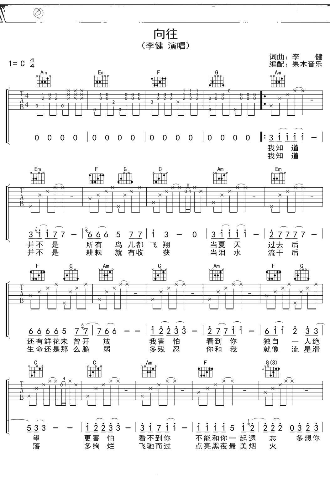 李健《向往》吉他谱 C调弹唱六线谱