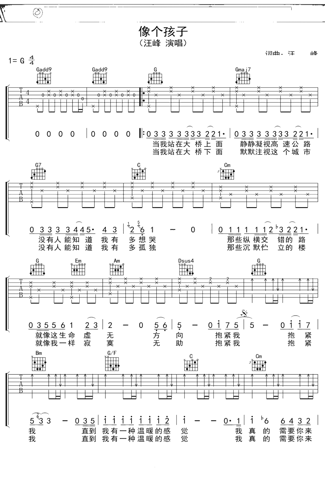汪峰《像个孩子》吉他谱 G调弹唱六线谱