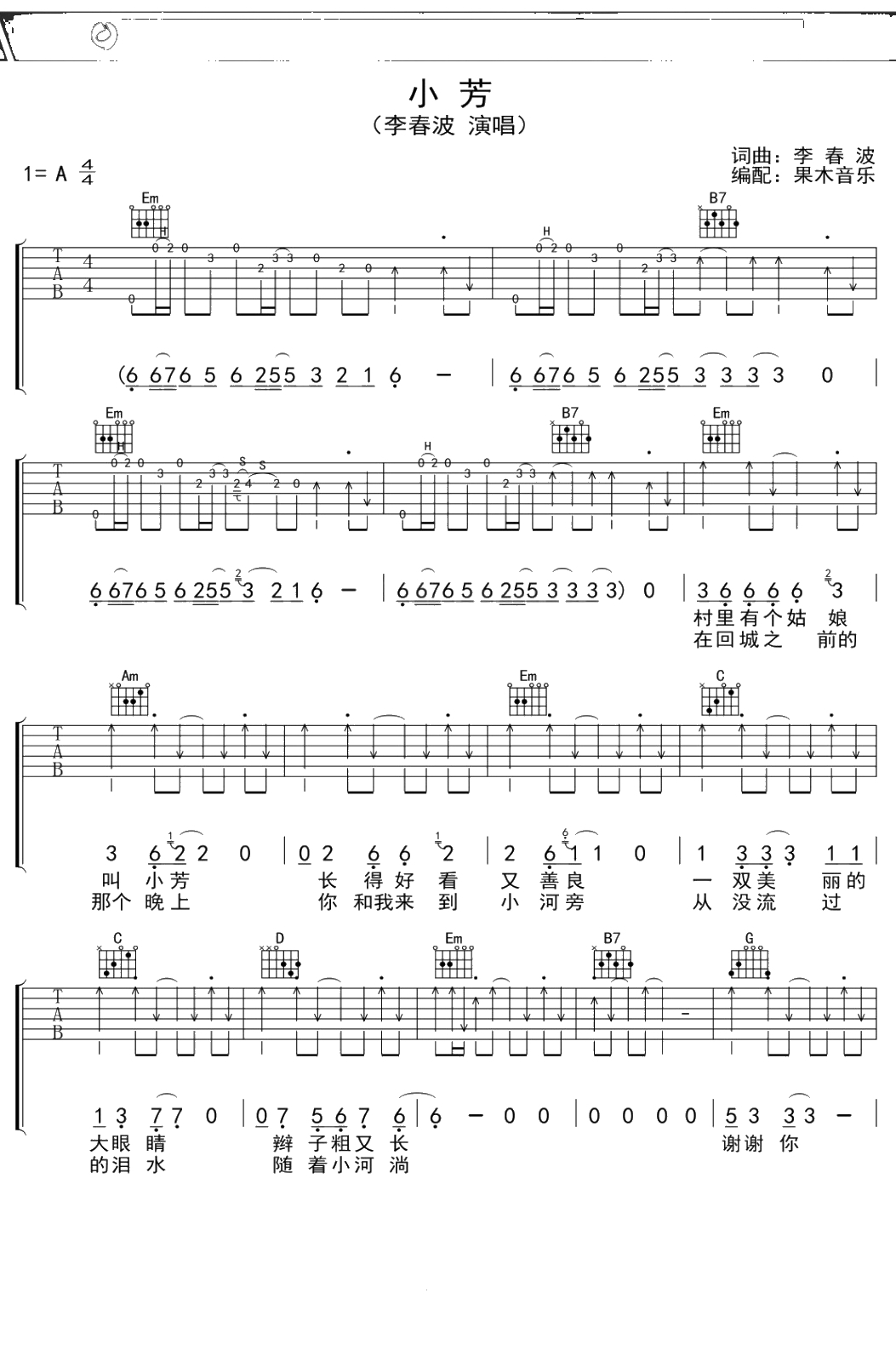 李春波《小芳》吉他谱 A调弹唱六线谱吉他谱