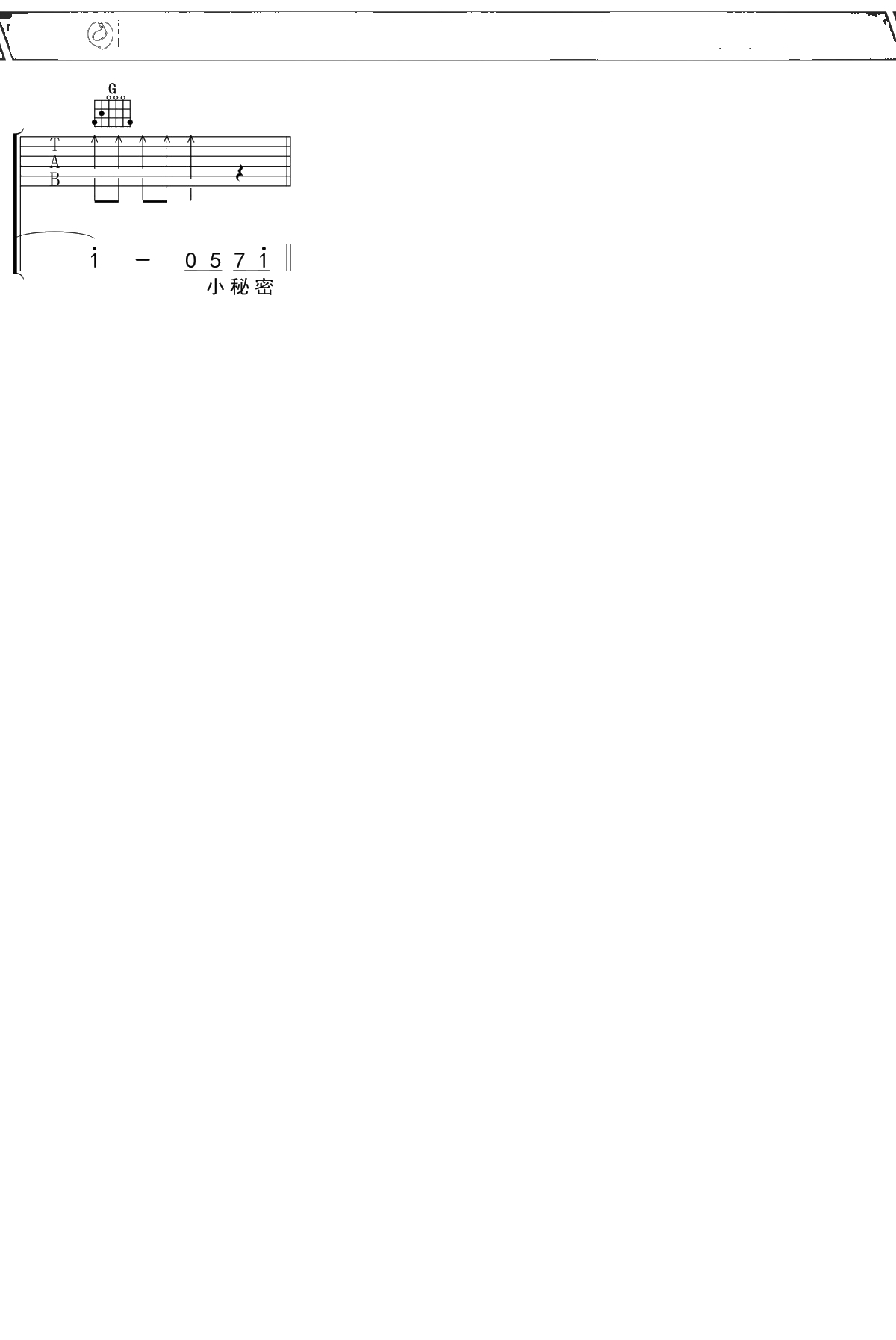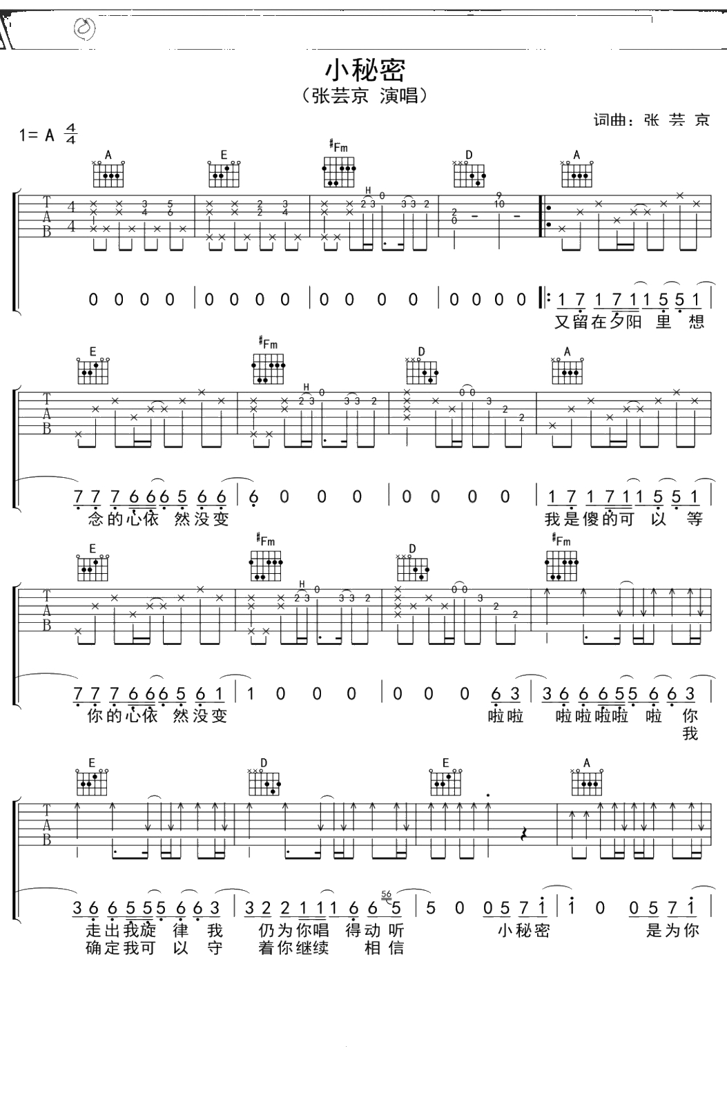 张芸京《小秘密》吉他谱 A调弹唱六线谱吉他谱