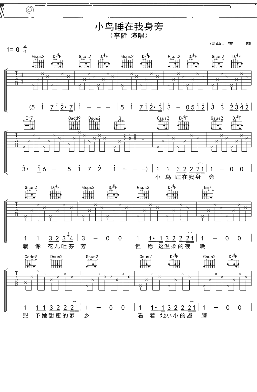 李健《小鸟睡在我身旁》吉他谱 G调弹唱六线谱吉他谱