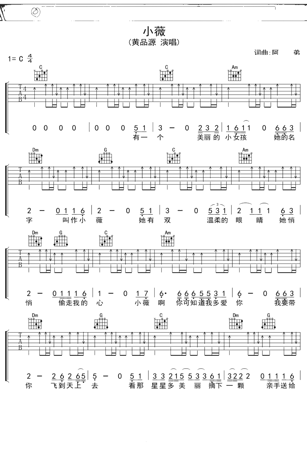 黄品源《小微》吉他谱 C调弹唱六线谱吉他谱