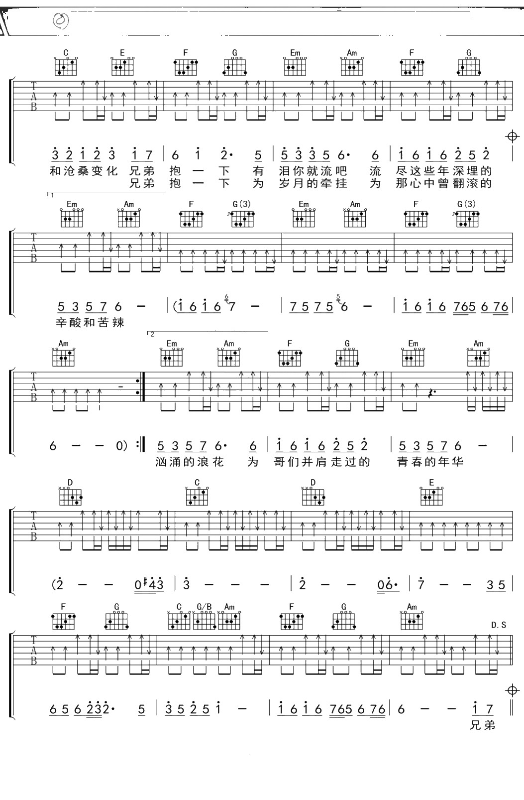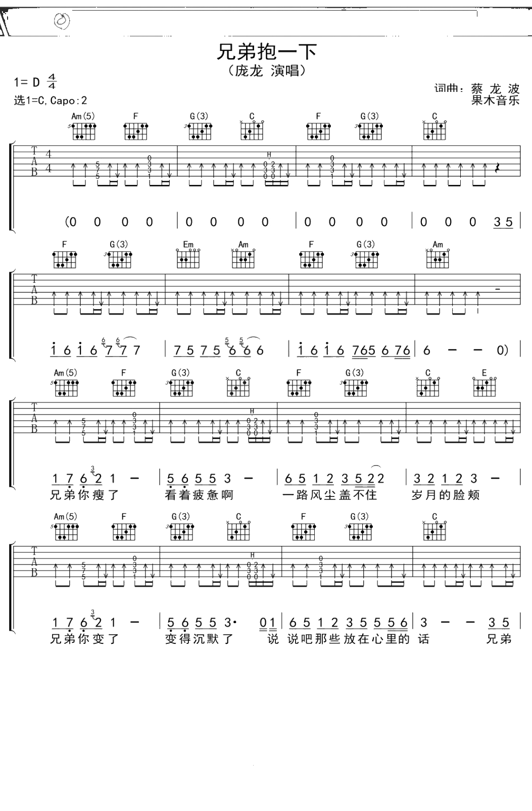 庞龙《兄弟抱一下》吉他谱 C调弹唱六线谱