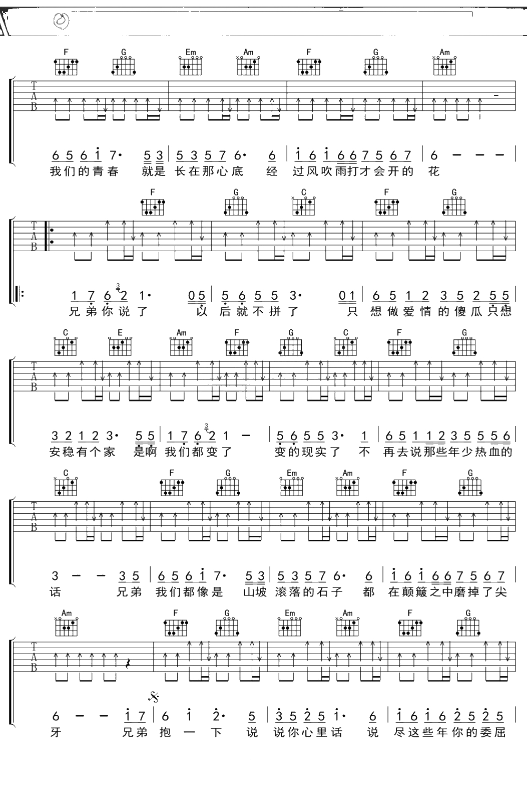 庞龙《兄弟抱一下》吉他谱 C调弹唱六线谱吉他谱
