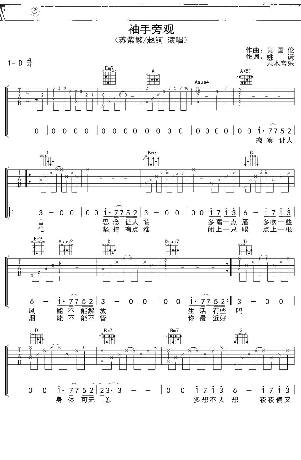 赵紫繁《袖手旁观》吉他谱 D调弹唱六线谱