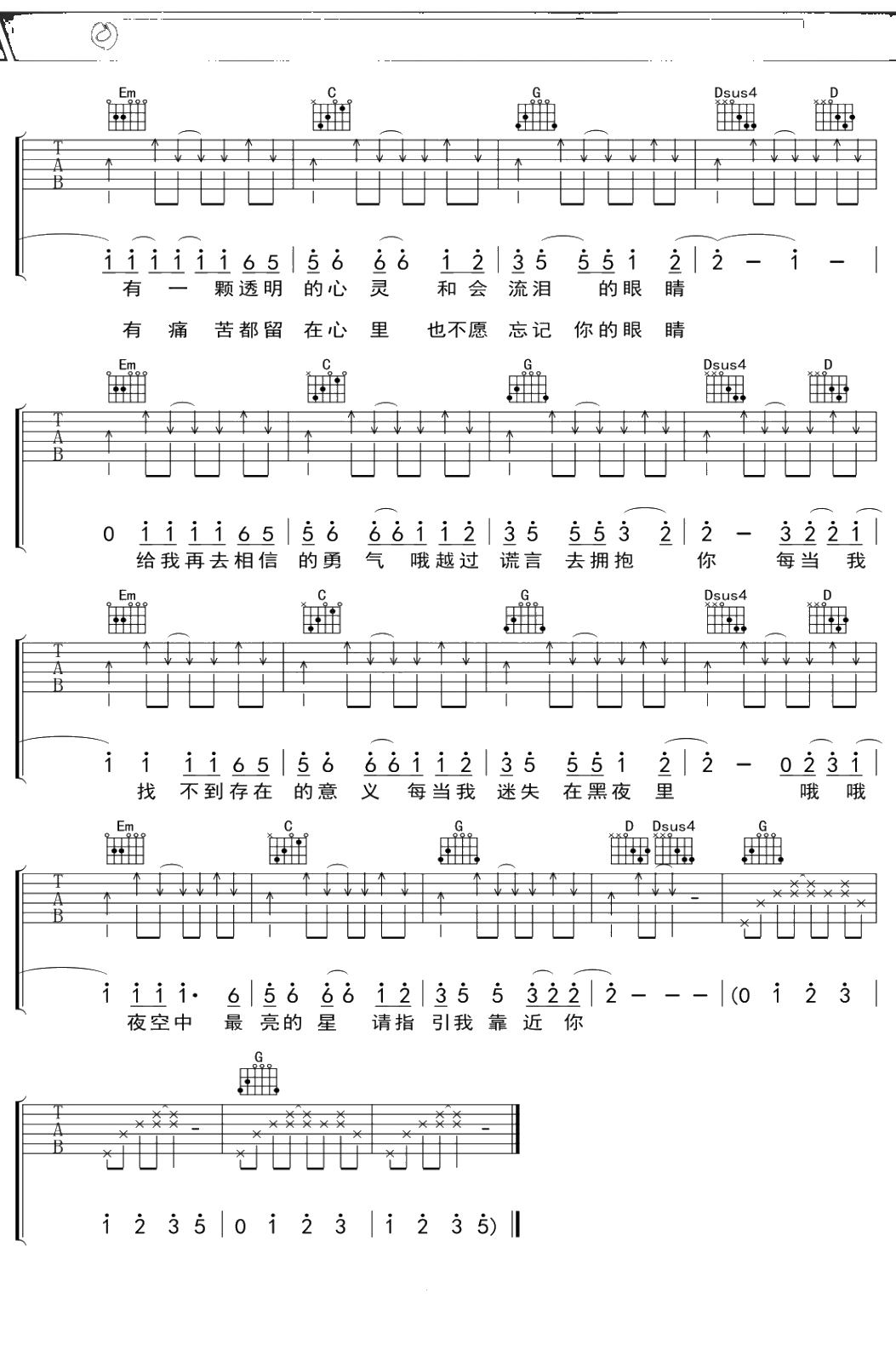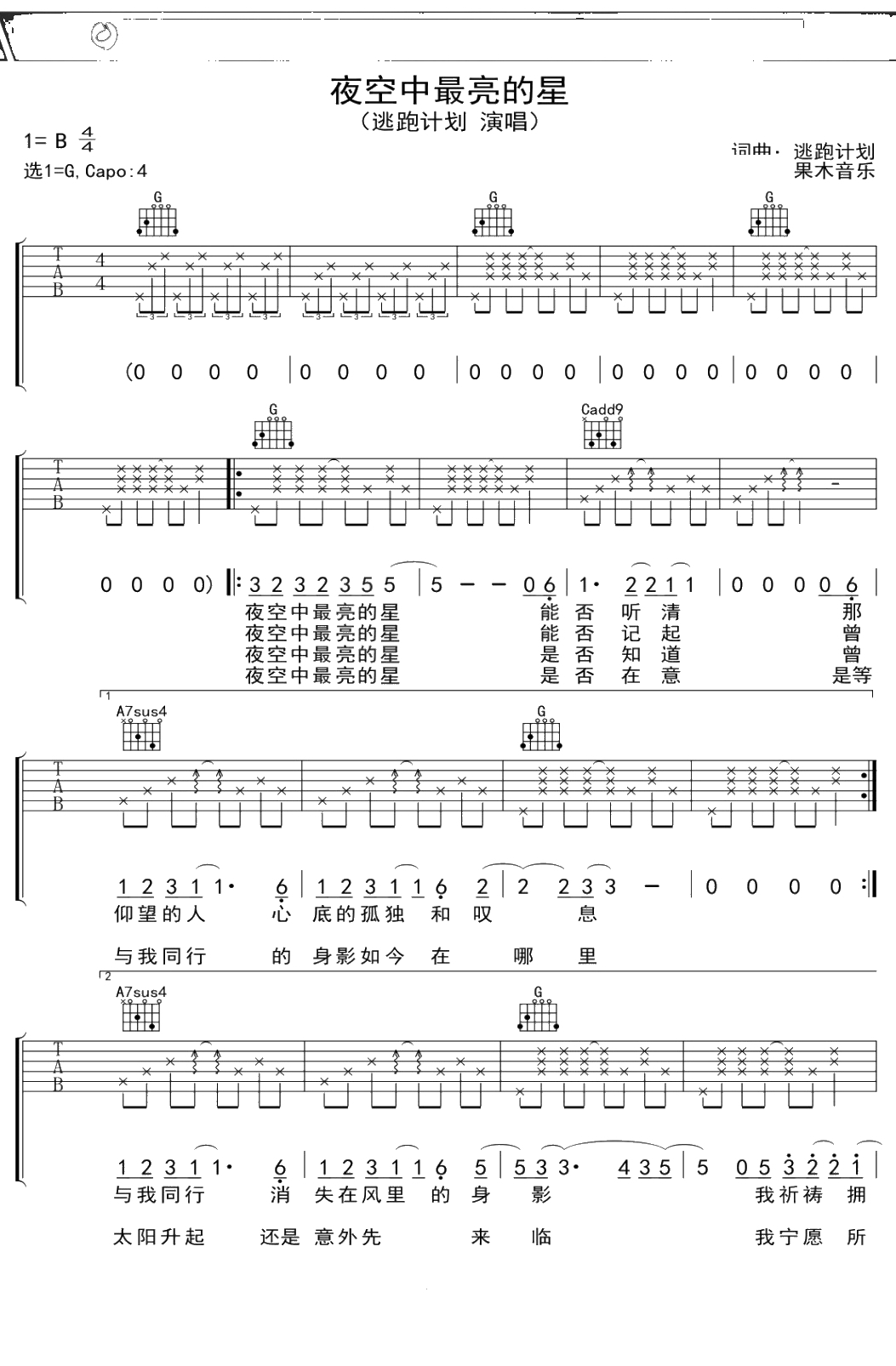 逃跑计划《夜空中最亮的星》吉他谱 G调弹唱六线谱吉他谱