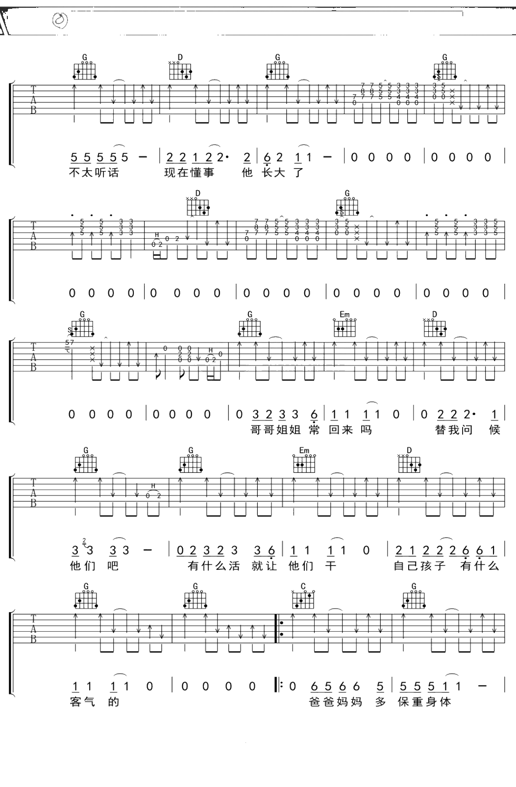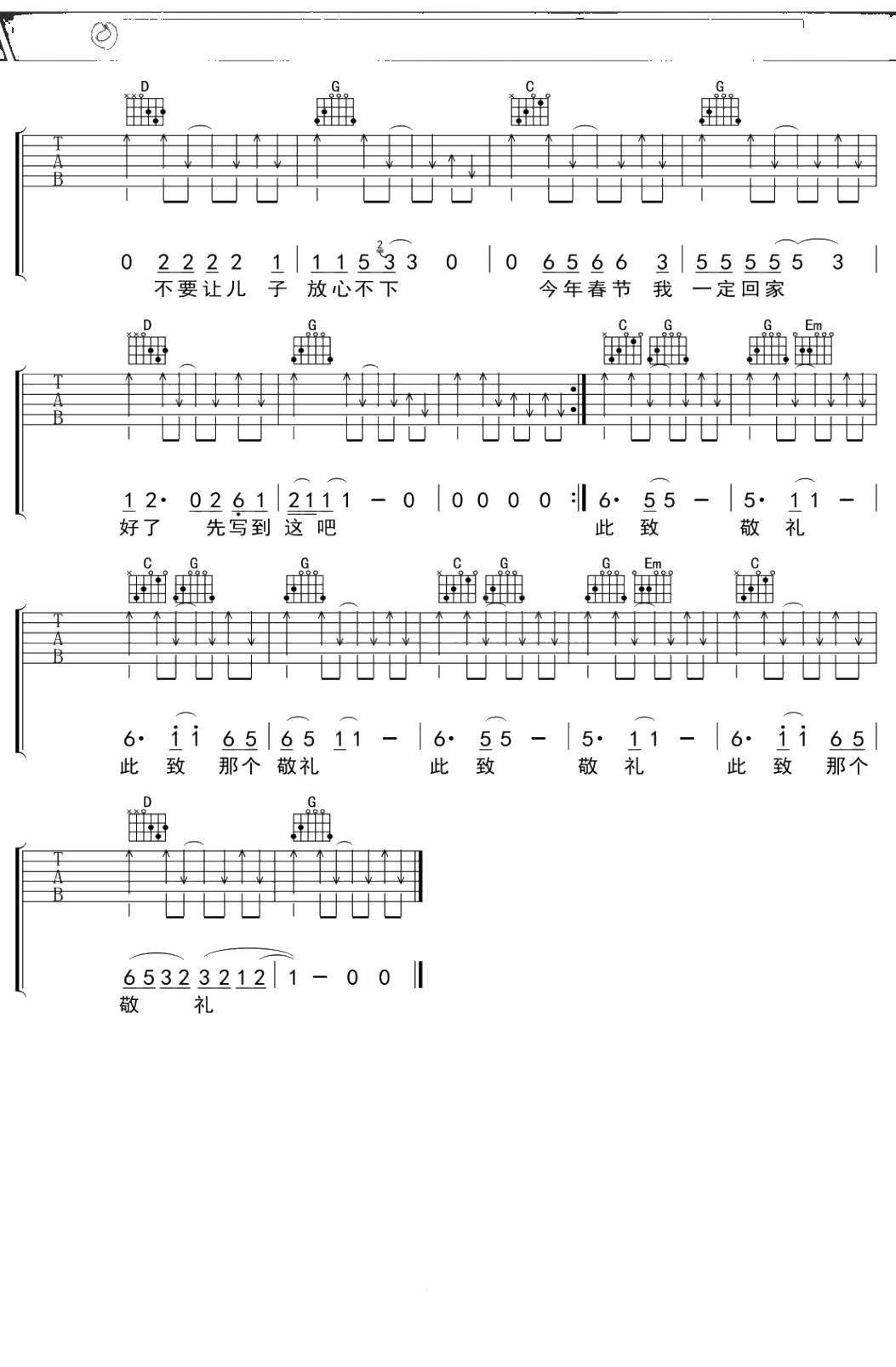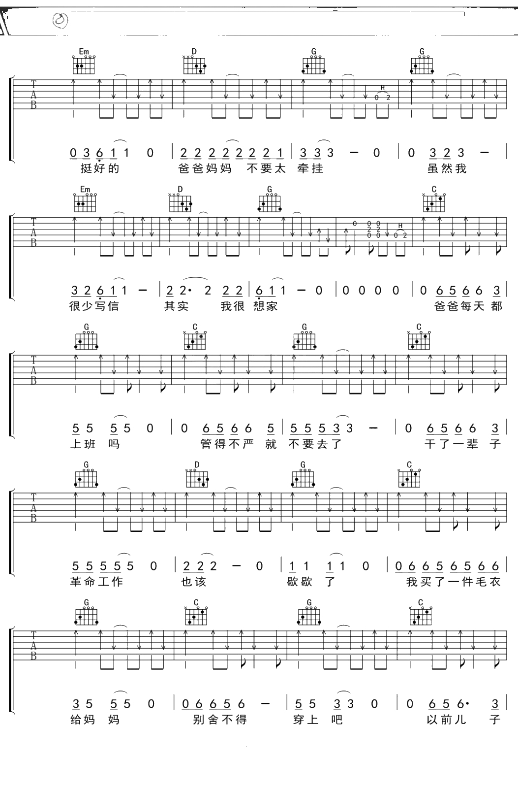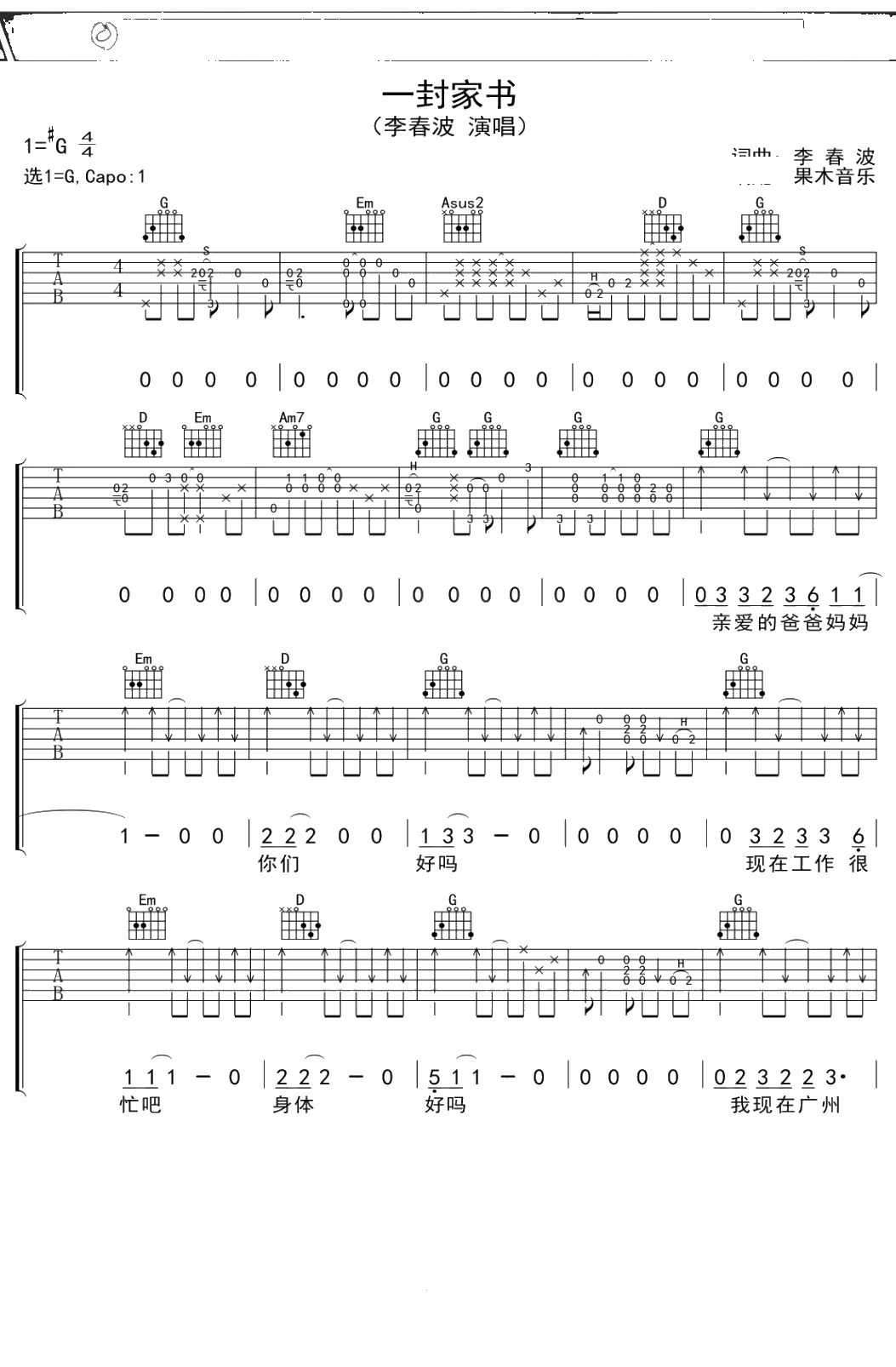 李春波《一封家书》吉他谱 G调弹唱六线谱