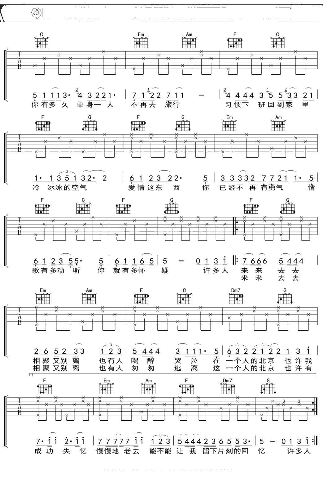 秦昊《一个人的北京》吉他谱 C调弹唱六线谱吉他谱
