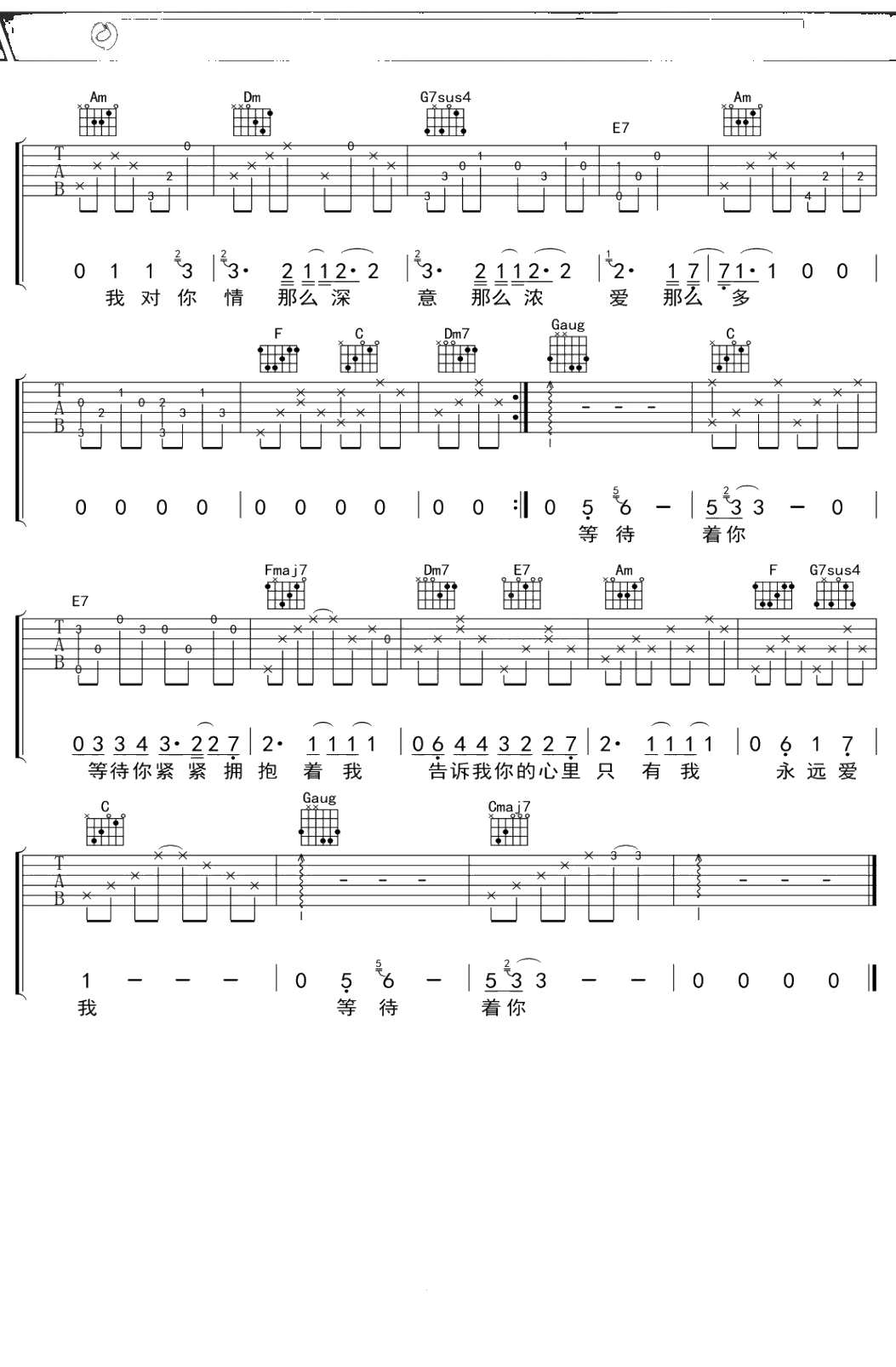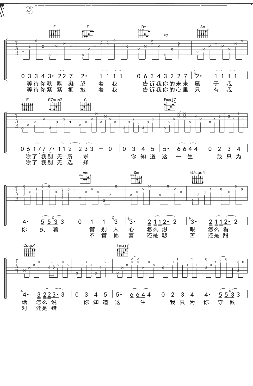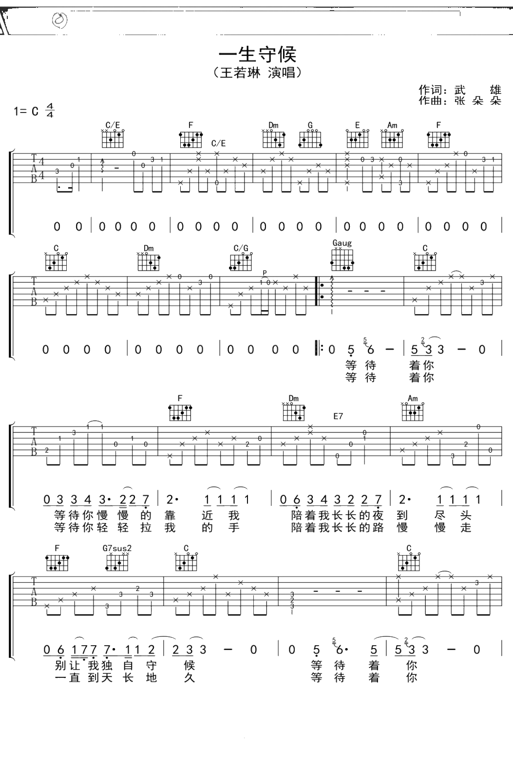 王若琳《一生守候》吉他谱 C调弹唱六线谱