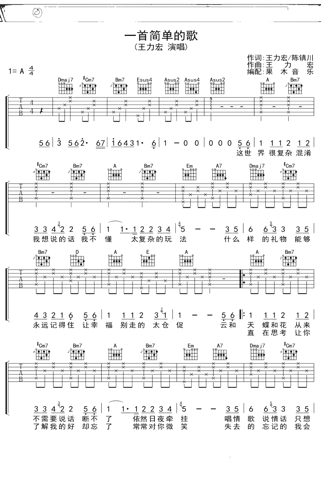 王力宏《一首简单的歌》吉他谱 A调弹唱六线谱吉他谱