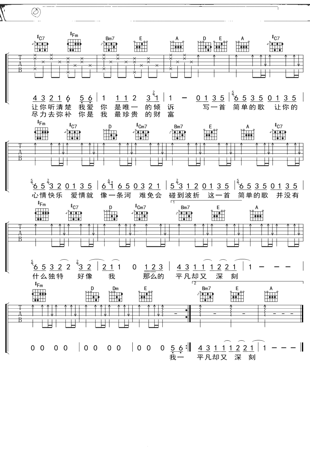王力宏《一首简单的歌》吉他谱 A调弹唱六线谱