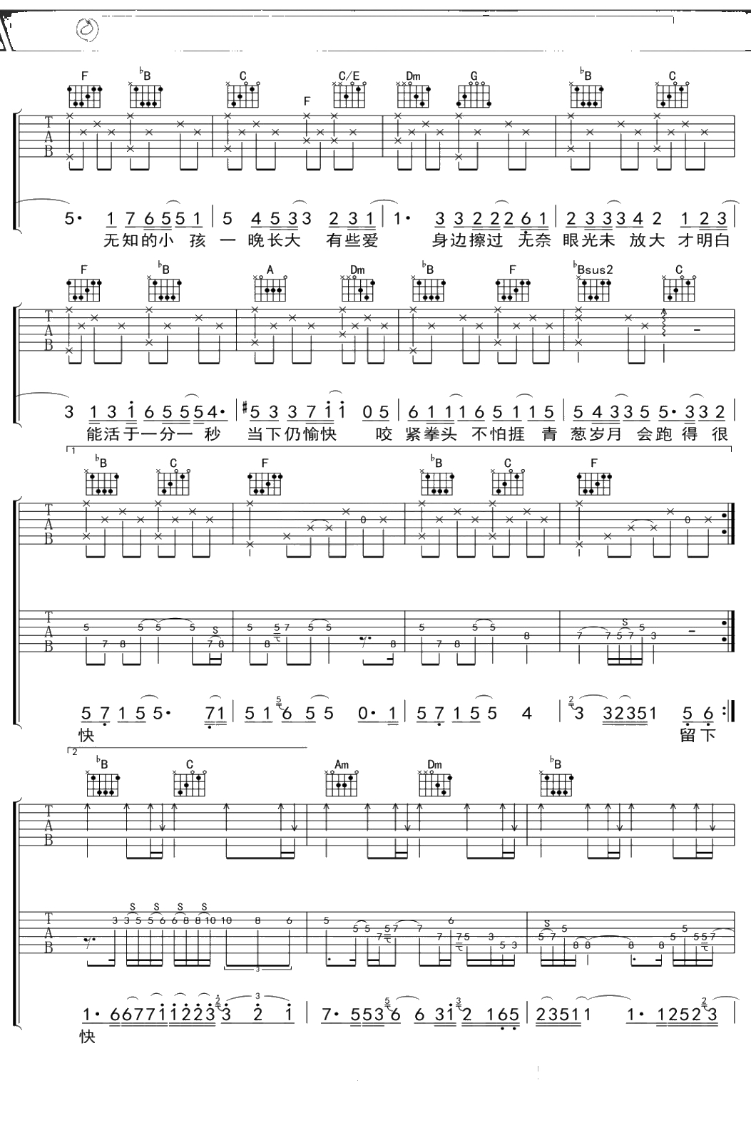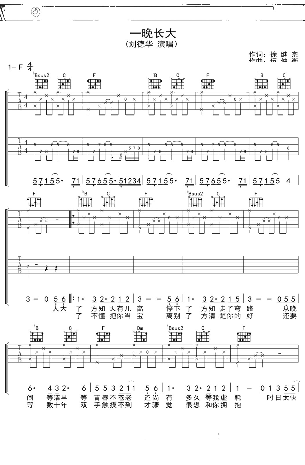 刘德华《一晚长大》吉他谱 F调弹唱六线谱