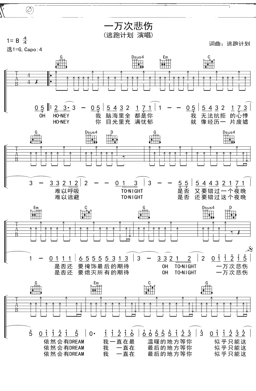 逃跑计划《一万次悲伤》吉他谱 G调弹唱六线谱吉他谱