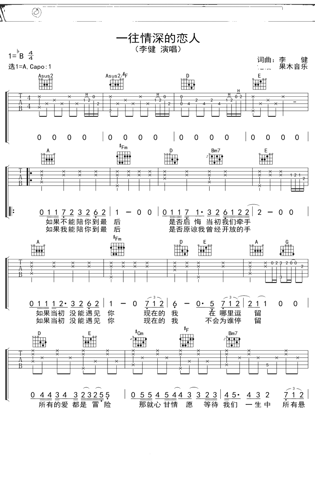 李健《一往情深的恋人》吉他谱 A调弹唱六线谱