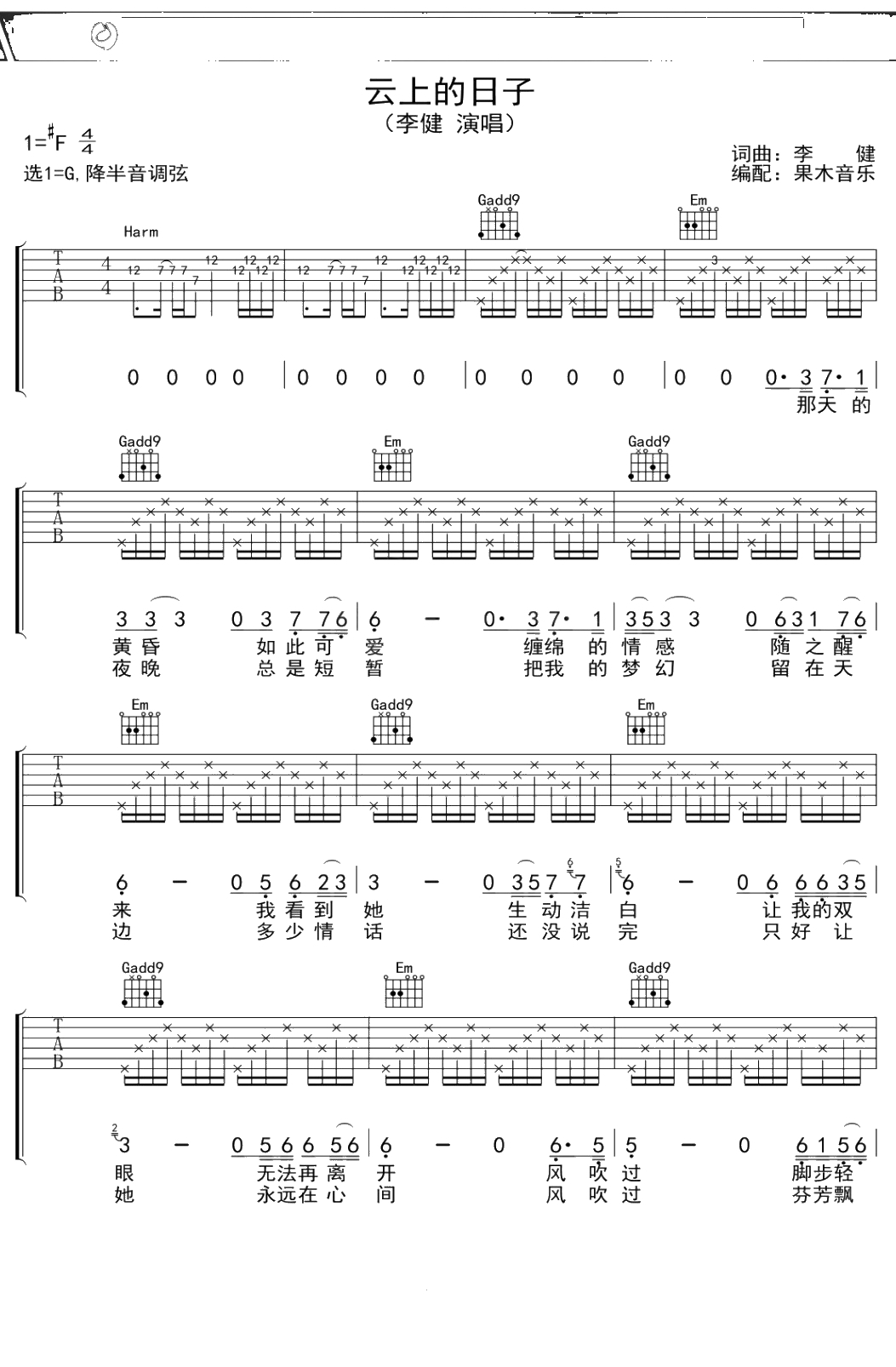 李健《云上的日子》吉他谱 G调弹唱六线谱