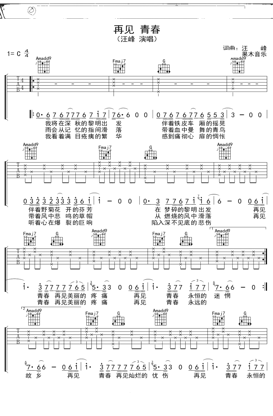 汪峰《再见青春》吉他谱 C调弹唱六线谱吉他谱