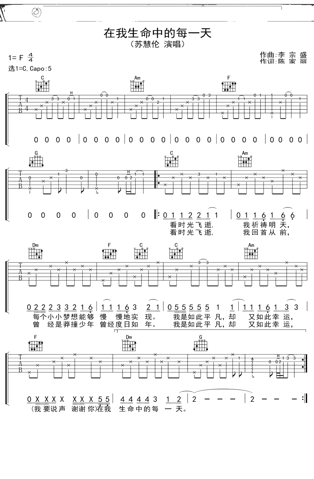 苏慧伦《在我生命中的每一天》吉他谱 C调弹唱六线谱