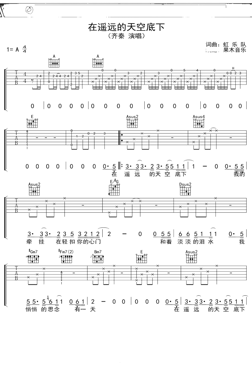 齐秦《在遥远的天空底下》吉他谱 A调弹唱六线谱