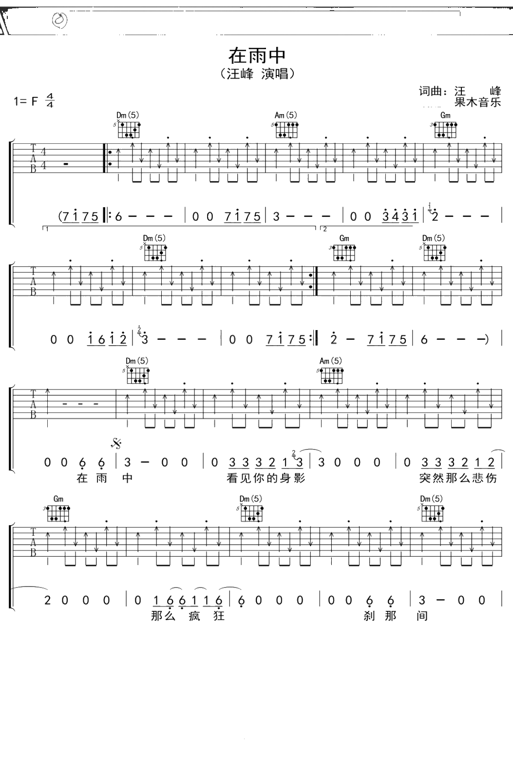 汪峰《在雨中》吉他谱 F调弹唱六线谱
