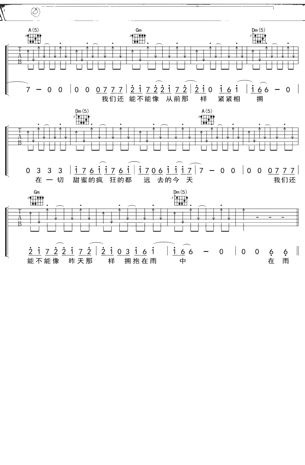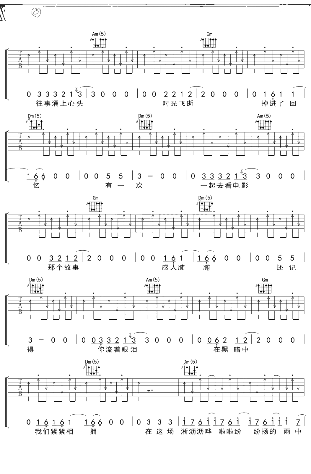 汪峰《在雨中》吉他谱 F调弹唱六线谱吉他谱