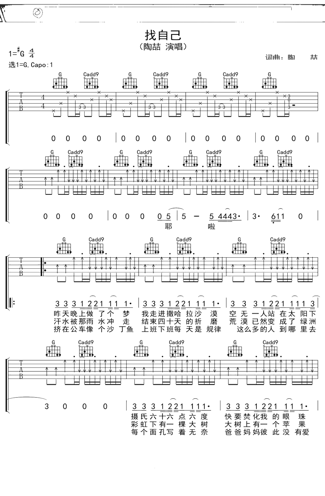 陶喆《找自己》吉他谱 G调弹唱六线谱吉他谱