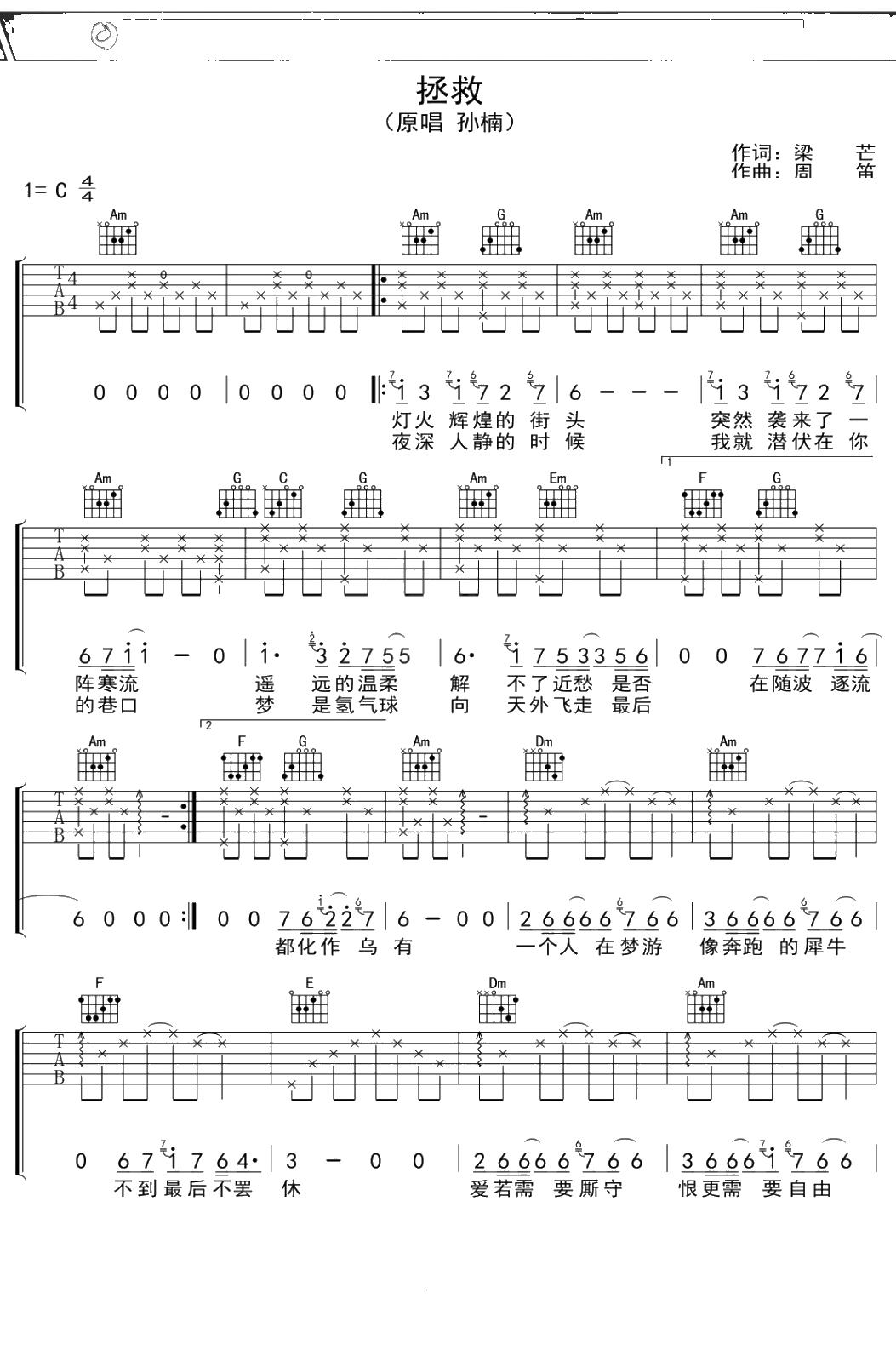 孙楠《拯救》吉他谱 C调弹唱六线谱