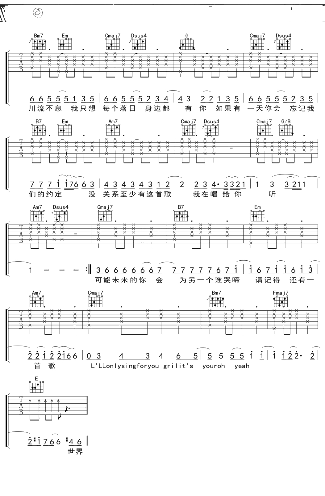 鹿晗《致爱your song》吉他谱 G调弹唱六线谱吉他谱