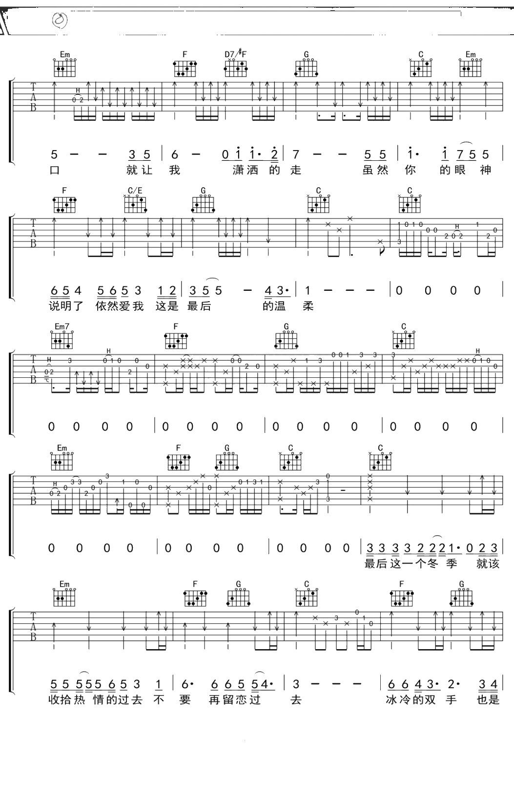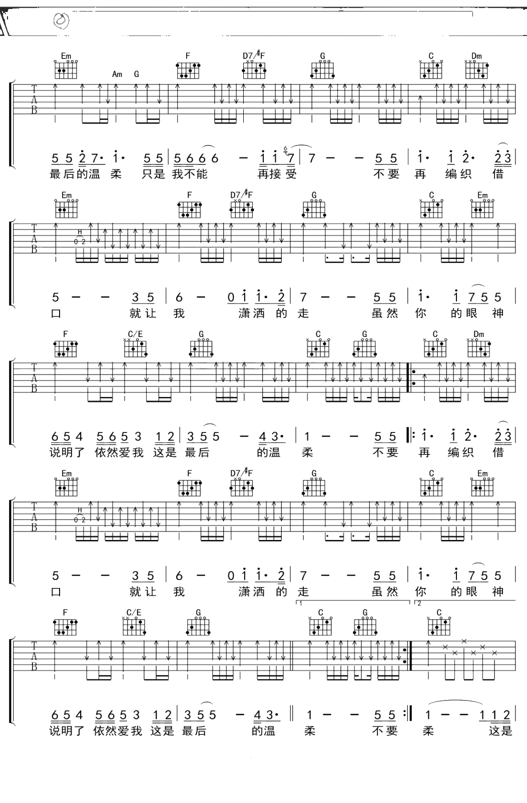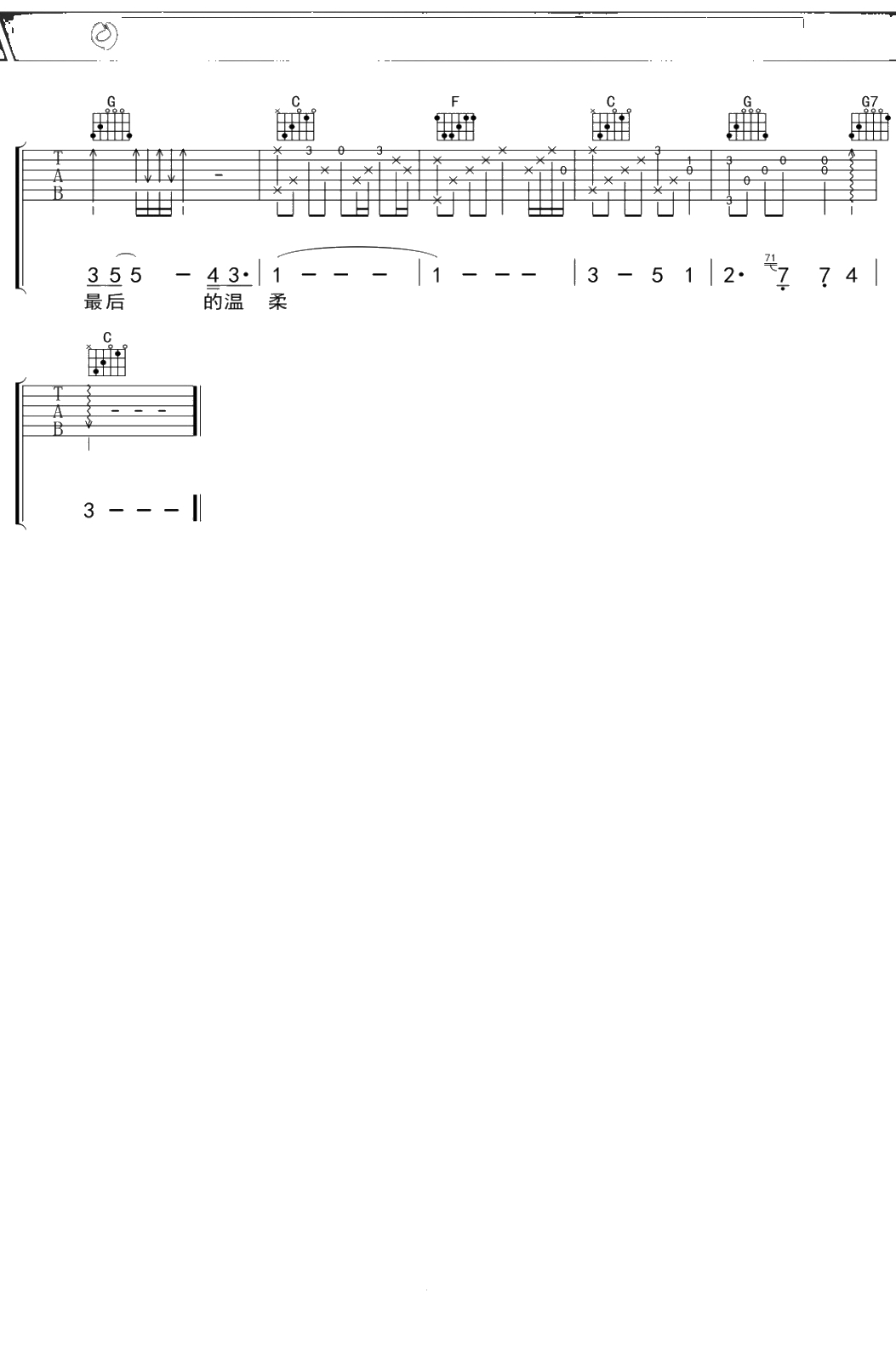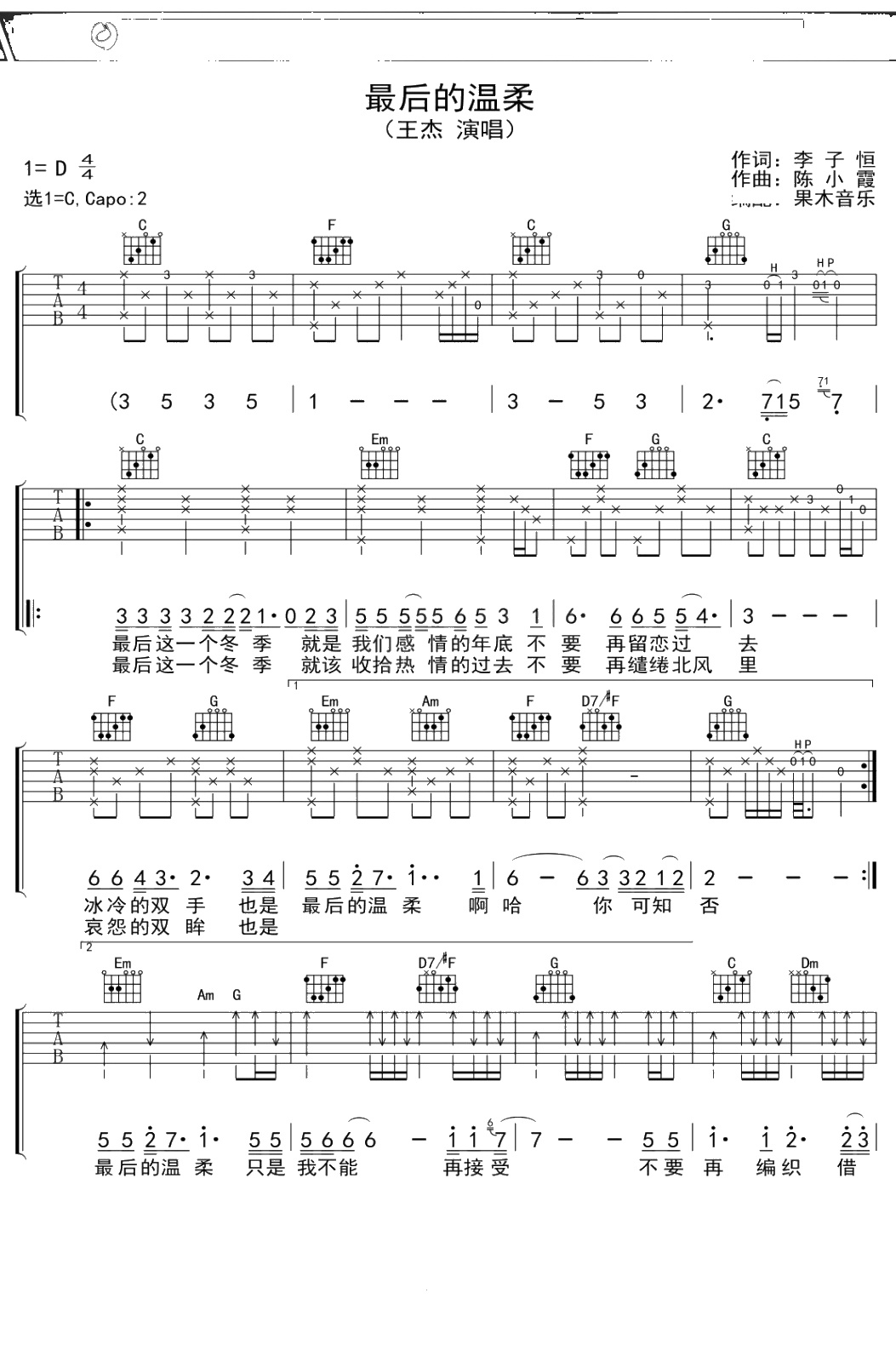 王杰《最后的温柔》吉他谱 C调弹唱六线谱