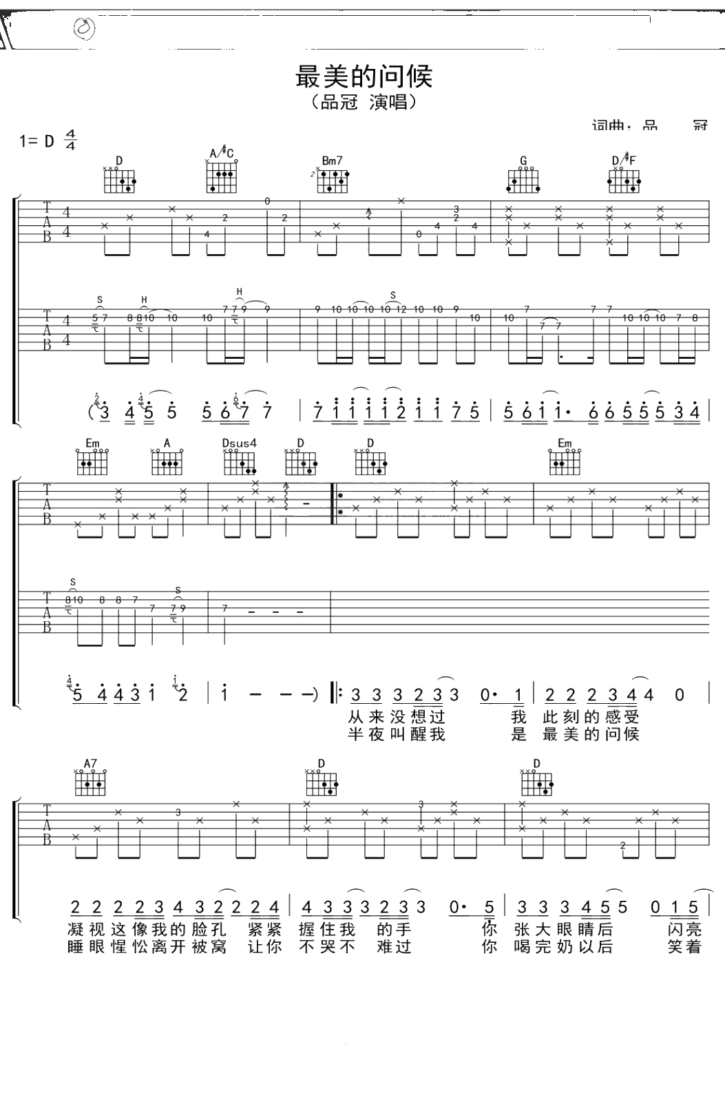 品冠《最美的问候》吉他谱 D调弹唱六线谱吉他谱