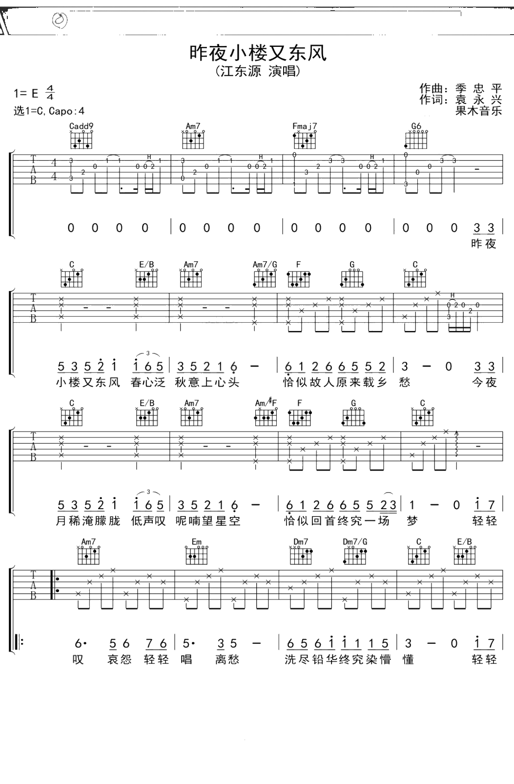 江东源《昨夜小楼又东风》吉他谱 C调弹唱六线谱吉他谱