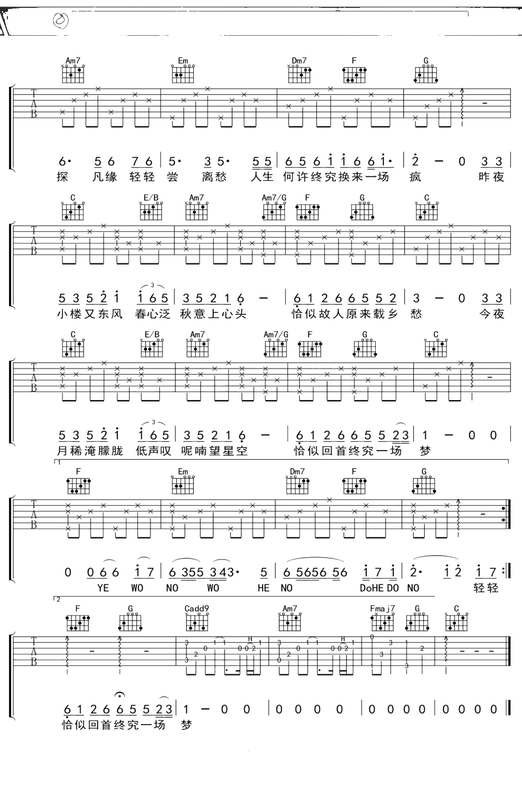 江东源《昨夜小楼又东风》吉他谱 C调弹唱六线谱
