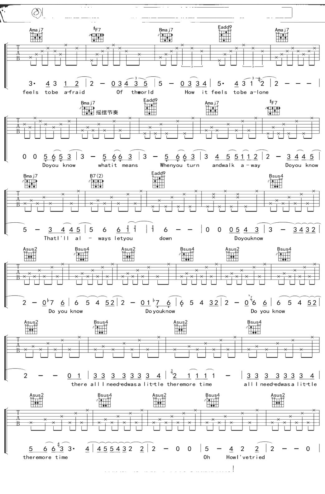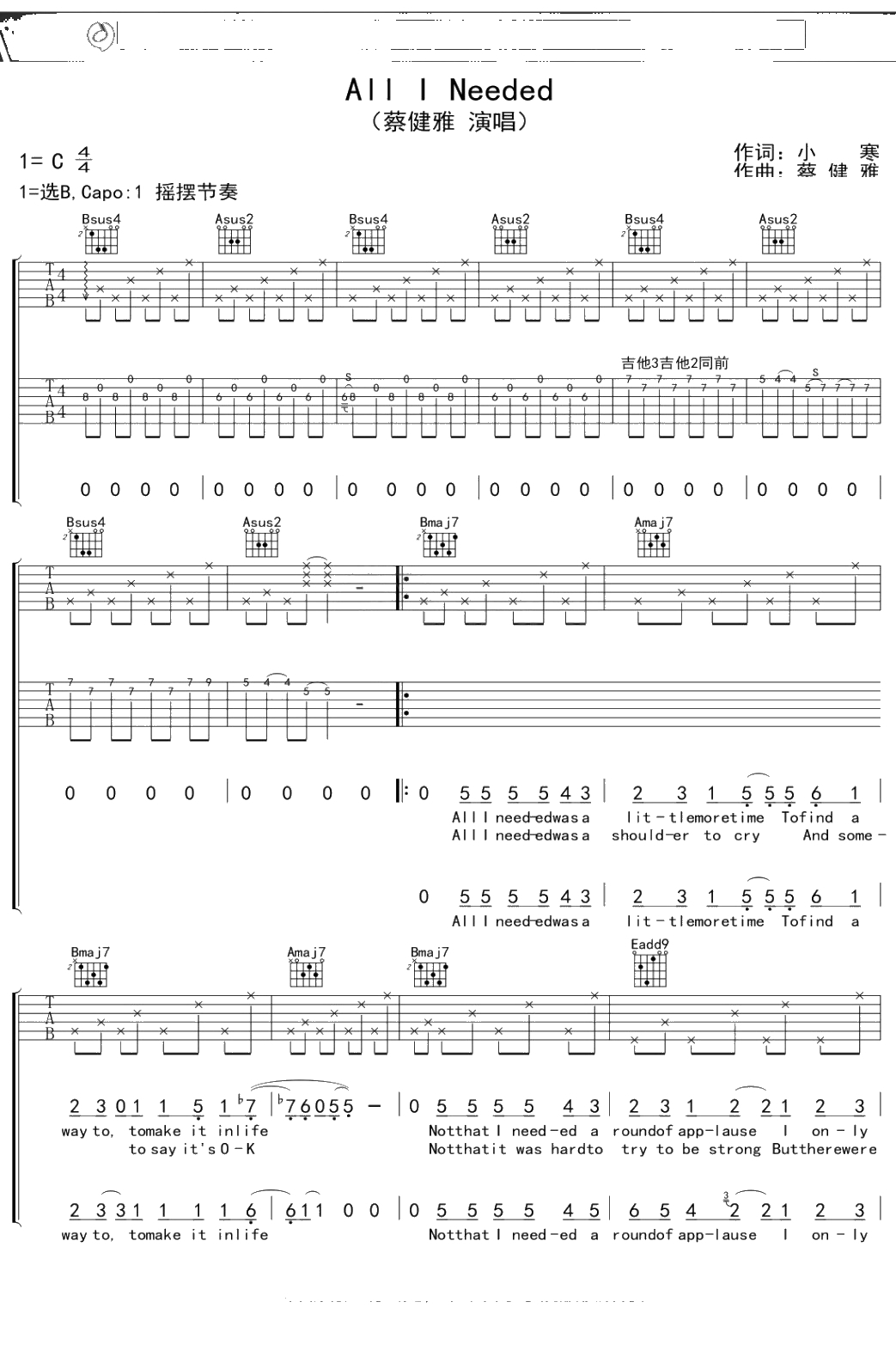 蔡健雅《All I Needed》吉他谱 B调弹唱六线谱吉他谱