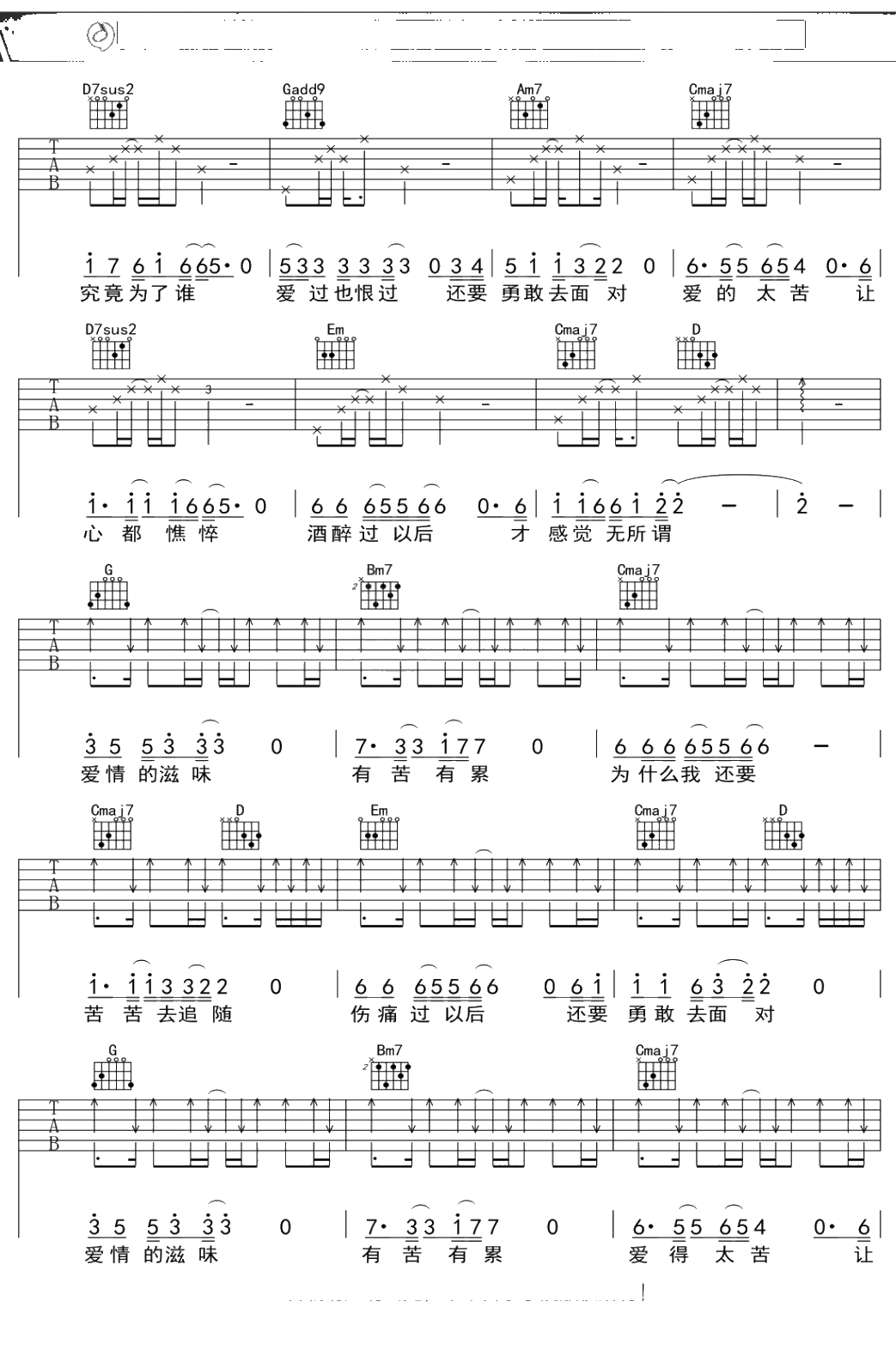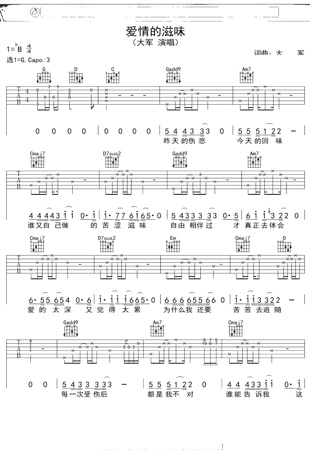 大军《爱情的滋味》吉他谱 G调弹唱六线谱