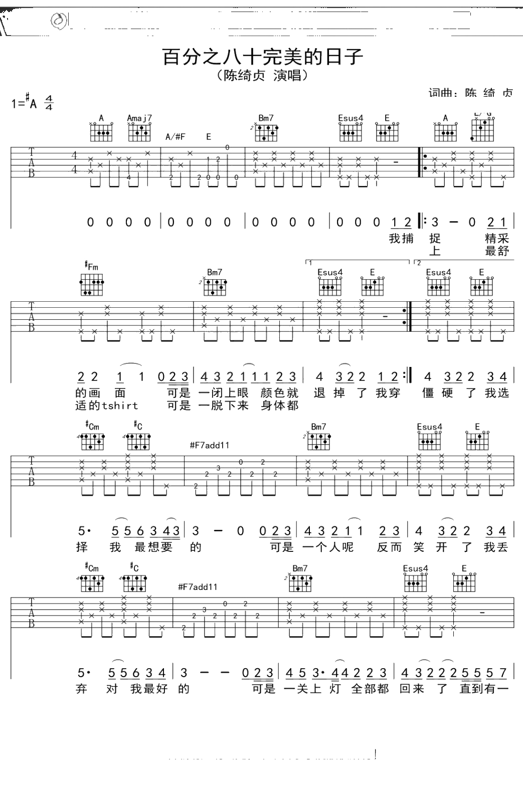陈绮贞《百分之八十完美的日子》吉他谱 A调弹唱六线谱