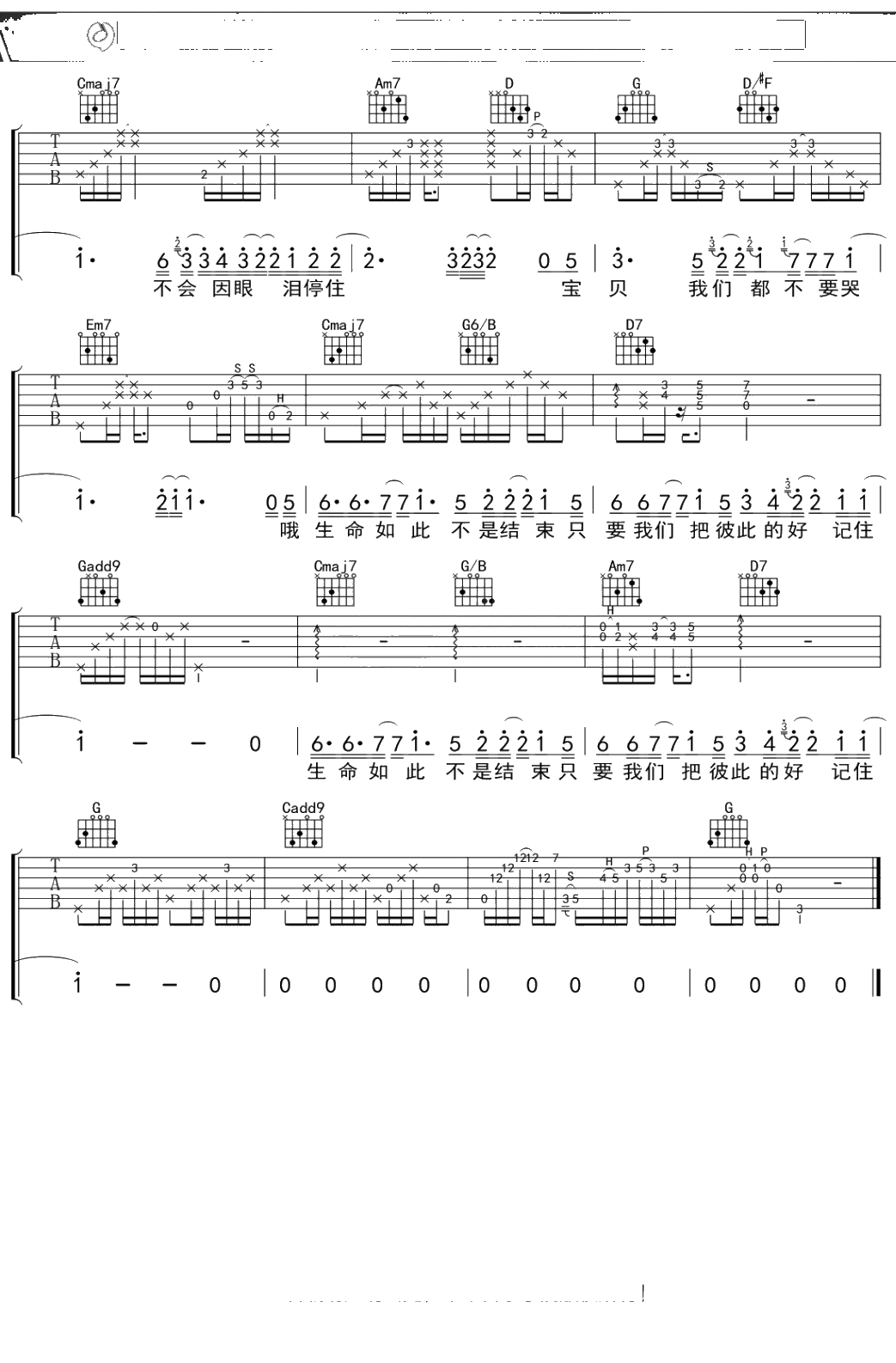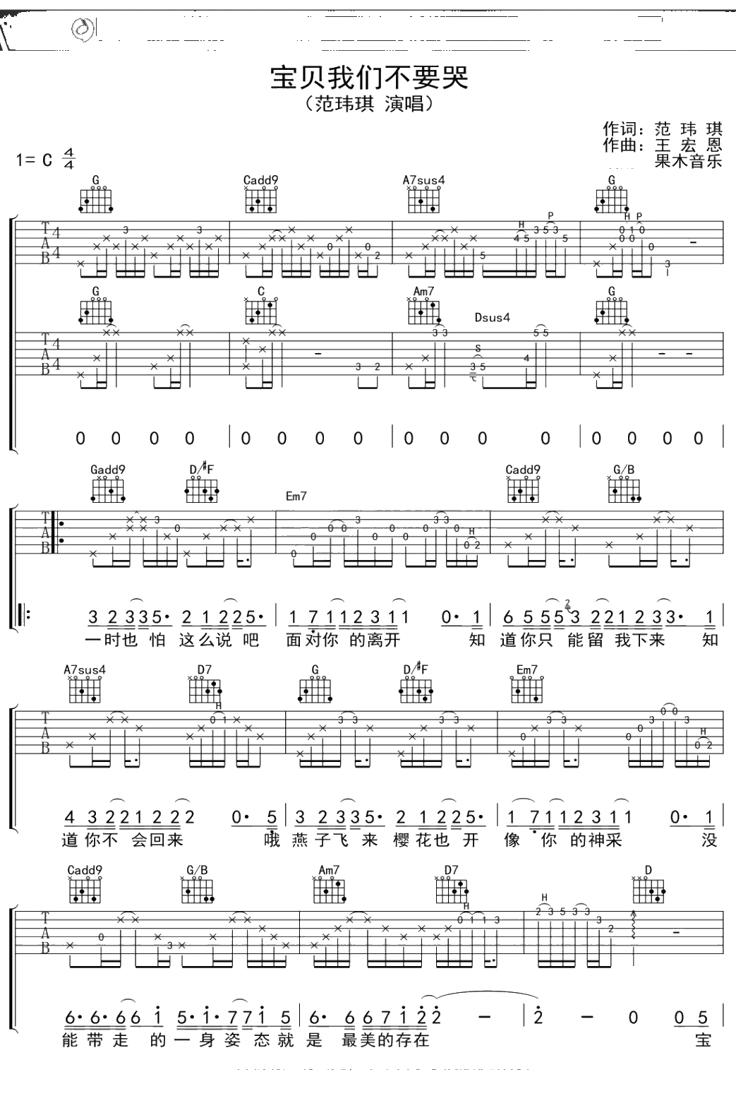 范玮琪《宝贝我们不哭》吉他谱 C调弹唱六线谱