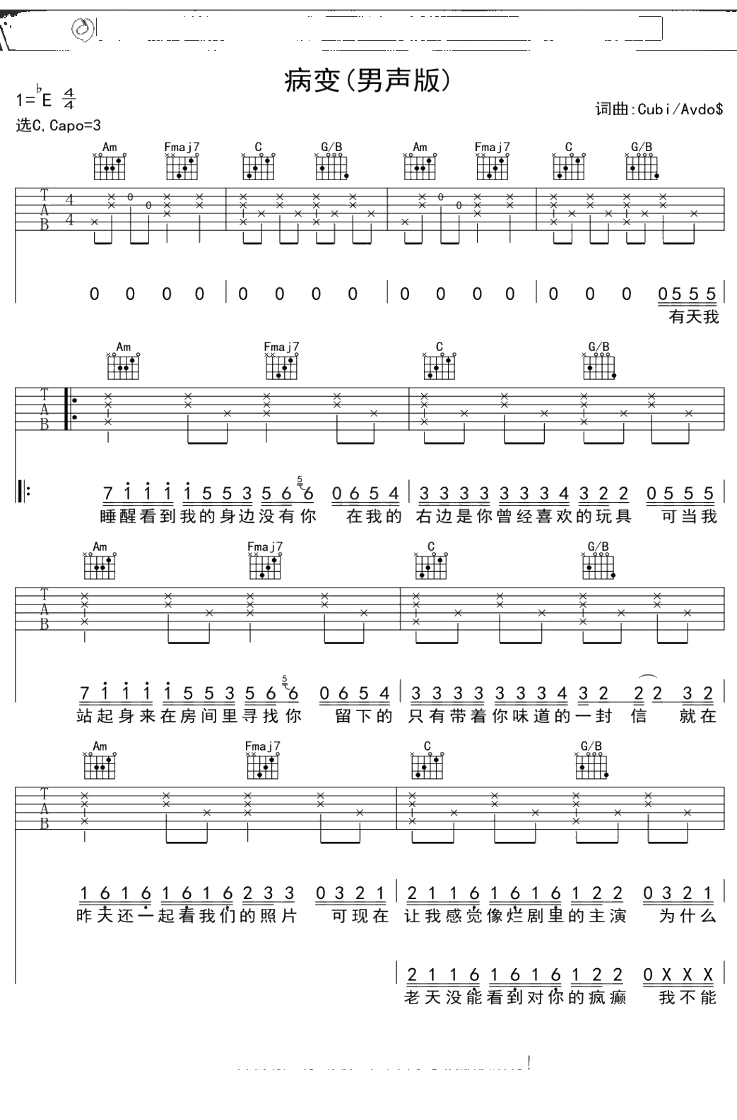 《病变》吉他谱 男生版 C调弹唱六线谱