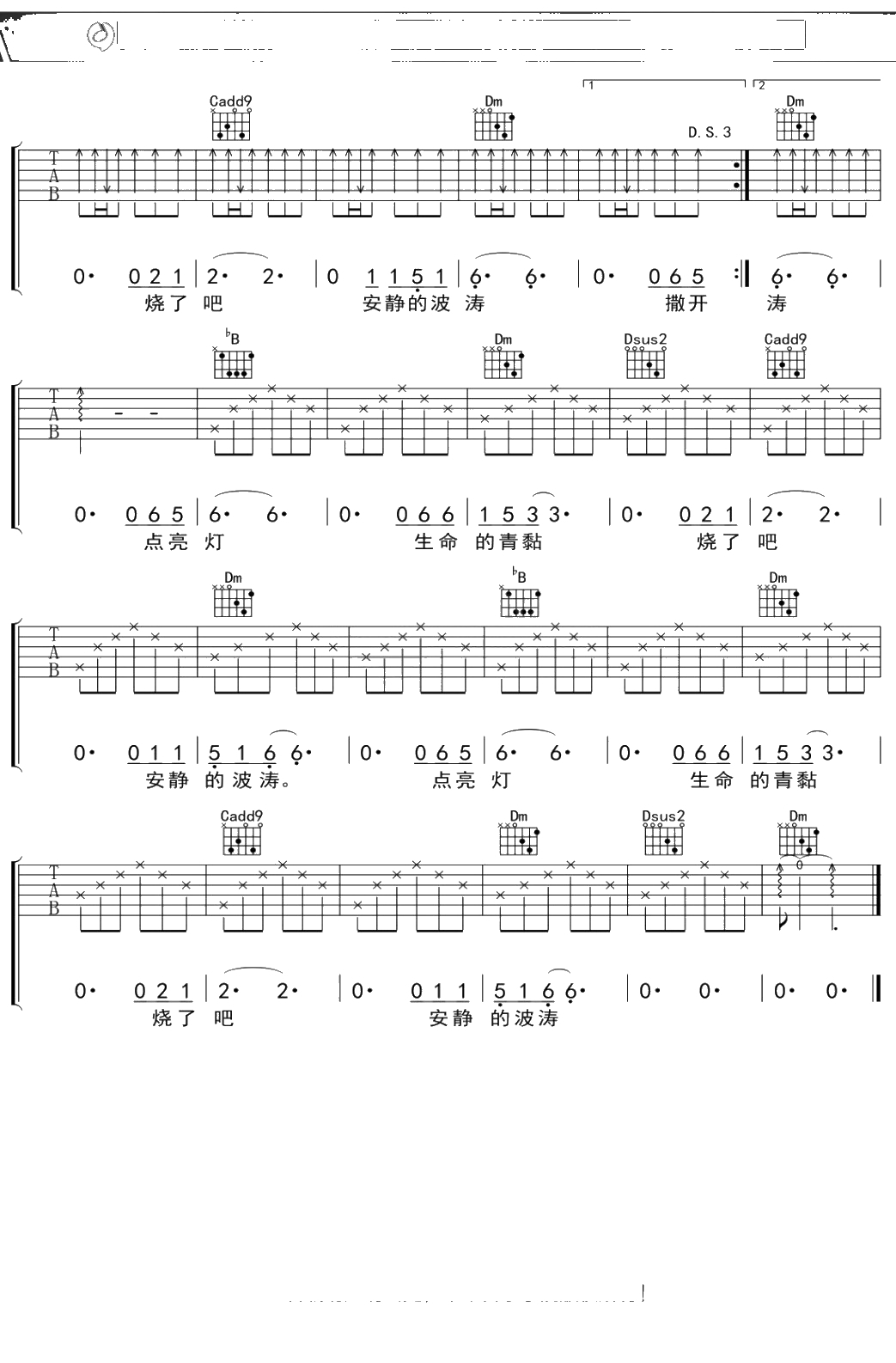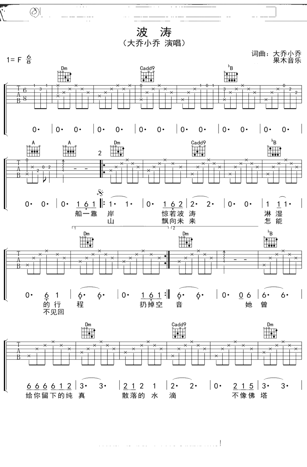 大乔小乔《波涛》吉他谱 F调弹唱六线谱吉他谱
