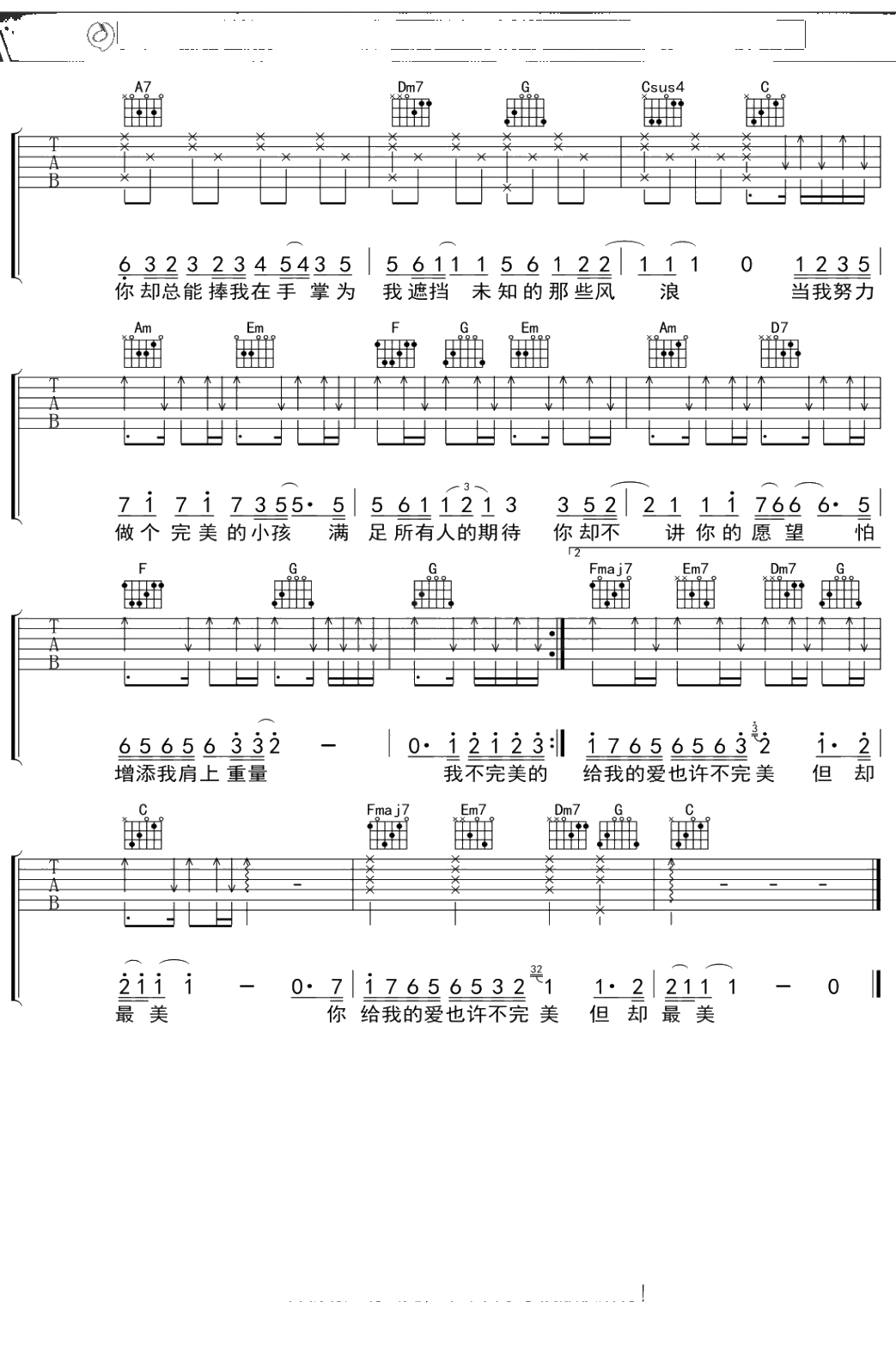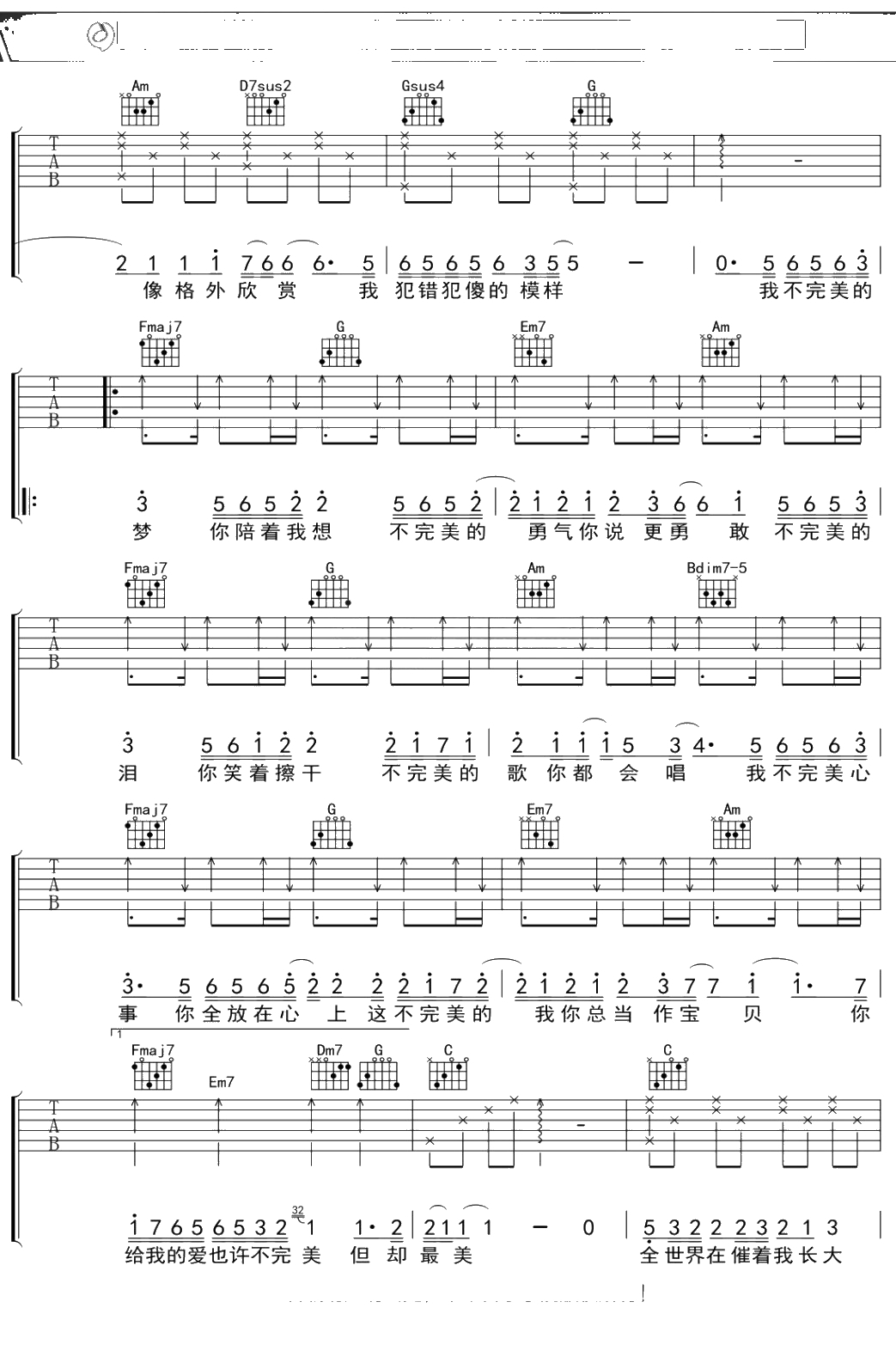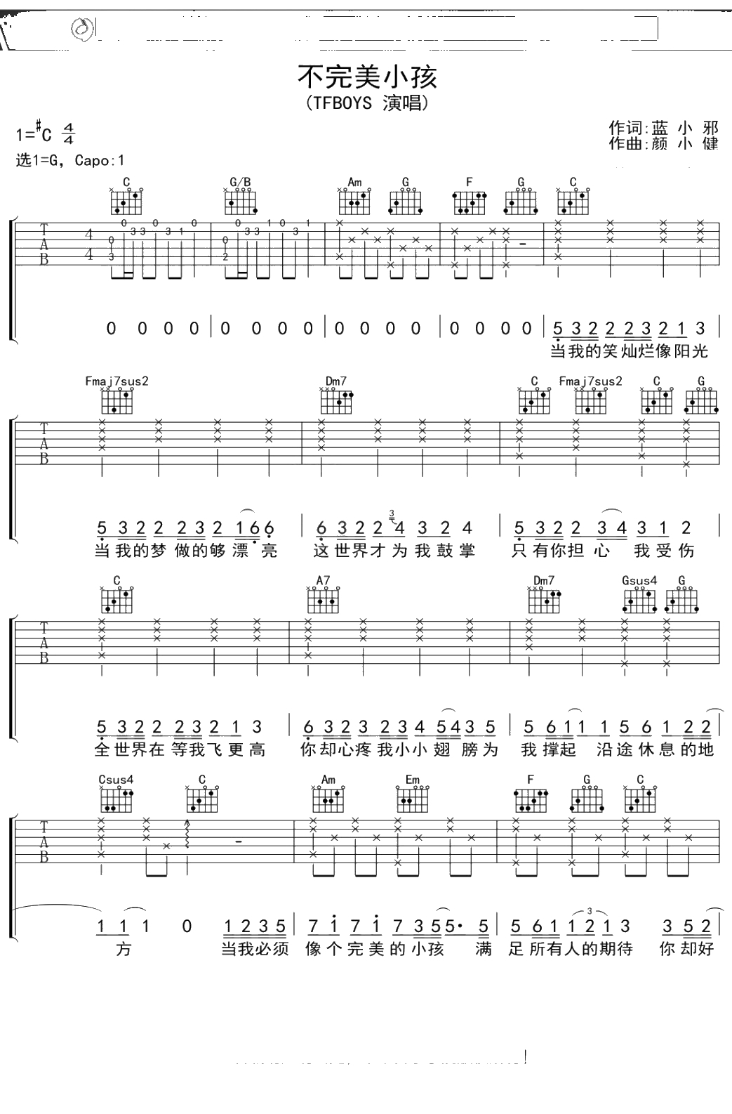 TFboys《不完美小孩》吉他谱 G调弹唱六线谱